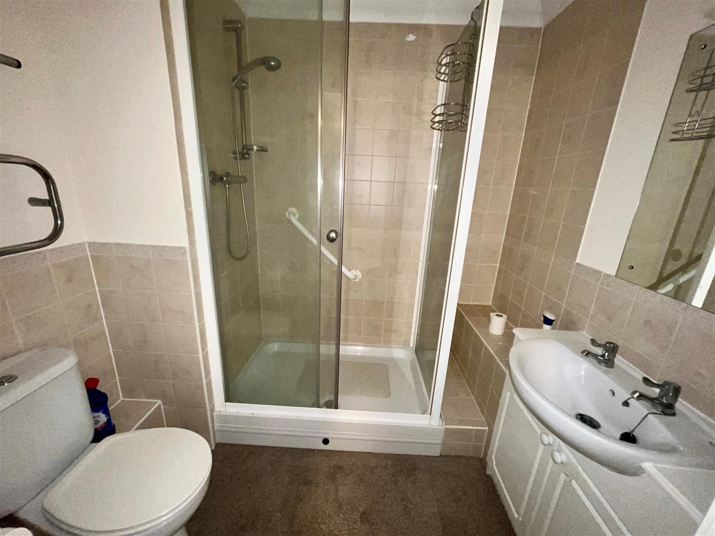 Shower Room - White suite comprising double shower cubicle, vanity wash basin with cupboard under and close coupled WC. Wall mounted heater.