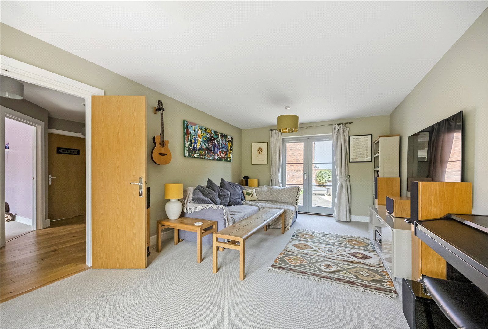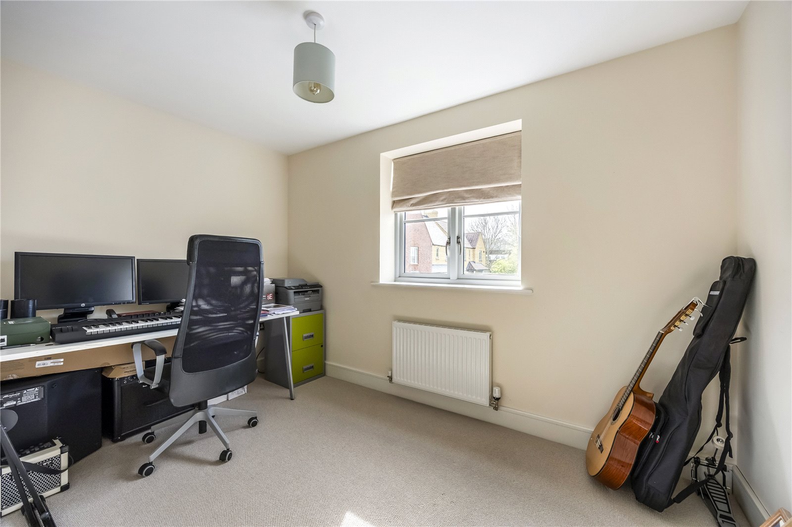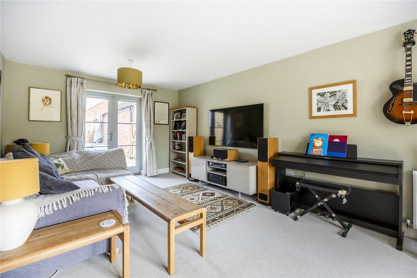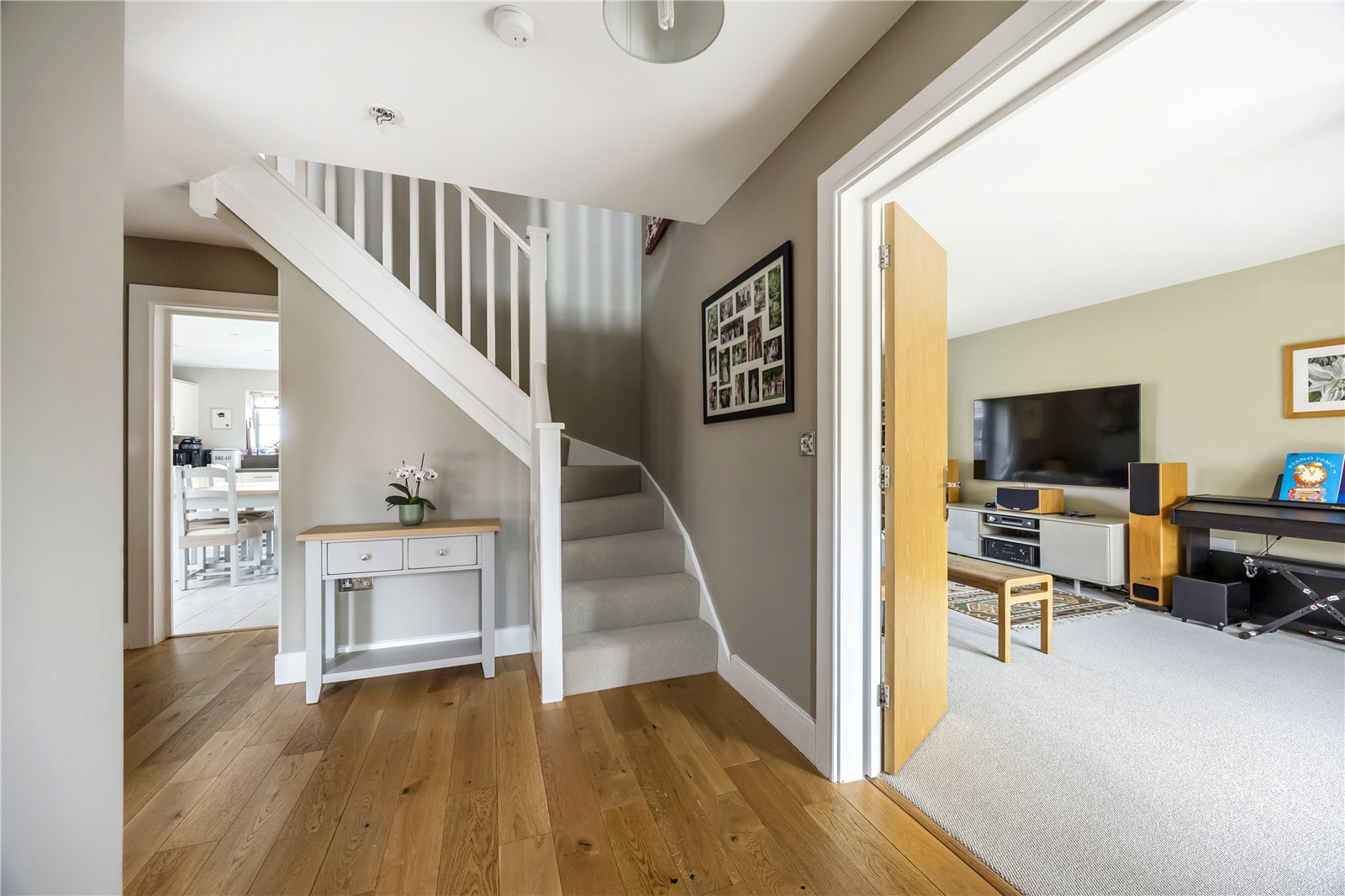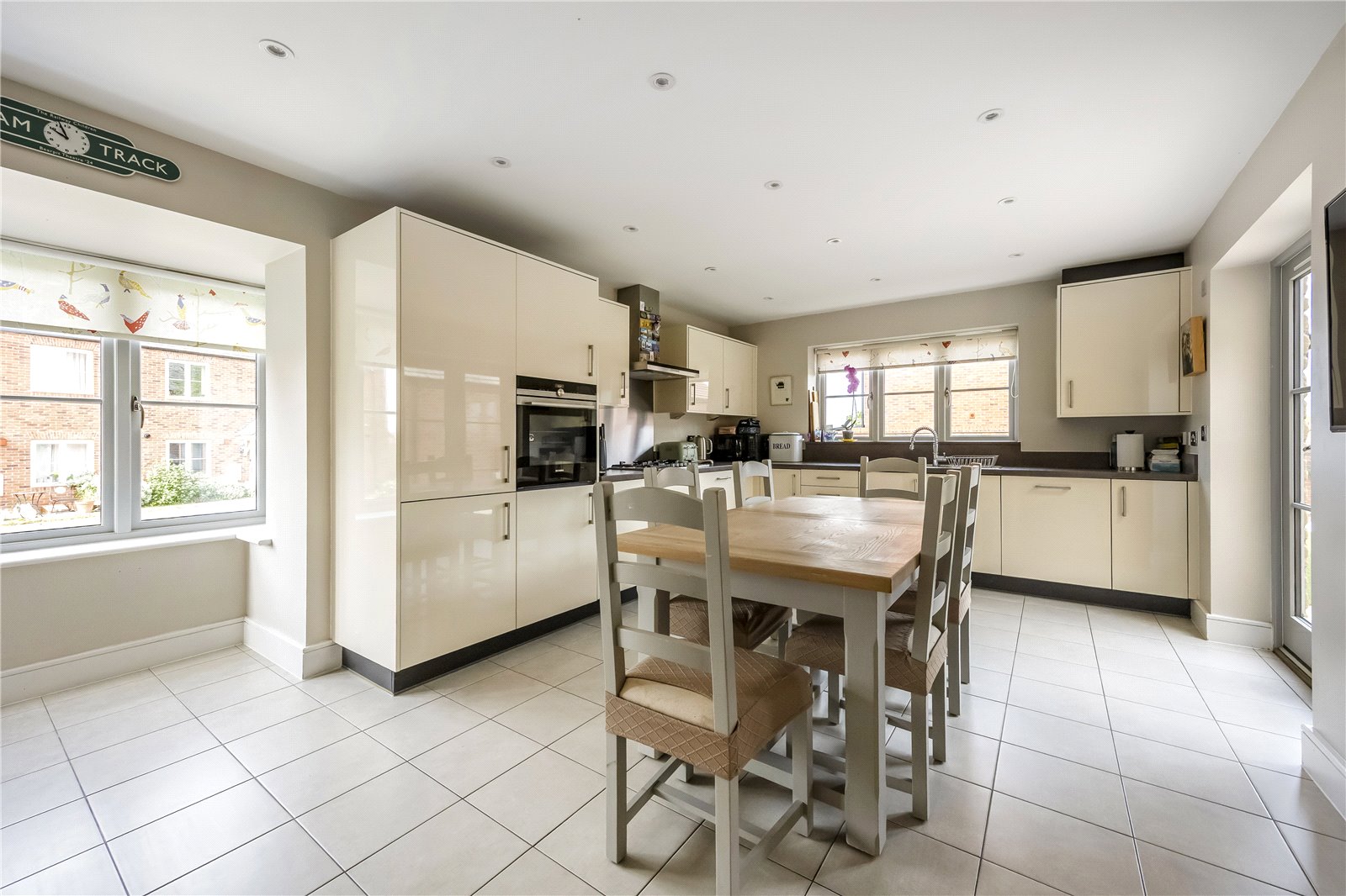 This well-proportioned detached residence comprises a welcoming entrance hall with doors leading to all ground floor rooms, along with stairs rising to the first floor. Double doors open into a dual-aspect living room, featuring a box bay window to the front and French doors opening onto the rear garden. A second versatile reception room, also benefiting from a box bay window, is currently used as a playroom but would equally suit a study or formal dining room.