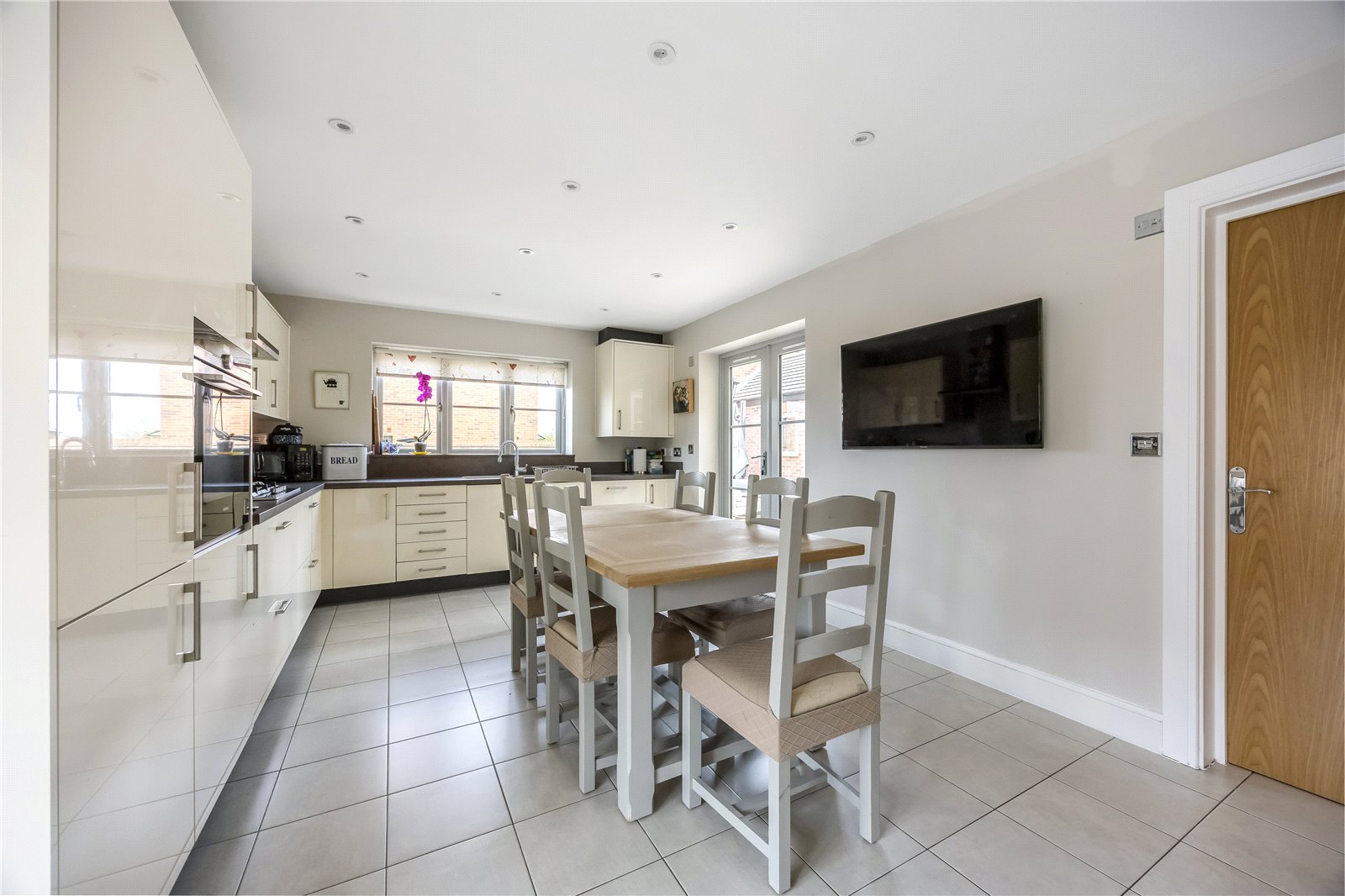 The well-appointed kitchen/dining room offers a range of wall and base units, integrated appliances, and ample space for a dining table. French doors provide access to the garden, and there is an additional door leading to a separate utility room.