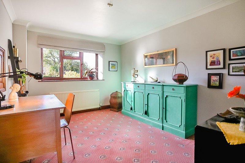 With oak laminate flooring, surround for bed, with single wardrobe to one side and four high level cupboards, outlook over rear garden and paddocks.