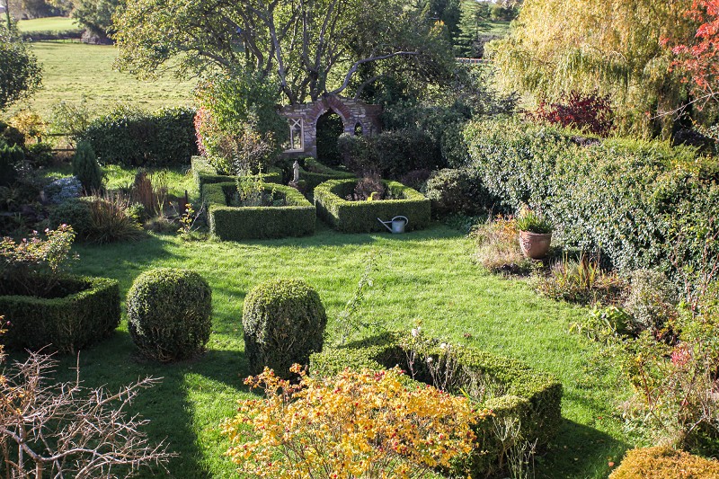 Main garden area with chancel garden with row of box hedges, country hedge surround, lawn and corner sited folly, stone trimmed ornamental pond and built-in garden seat, outside power point.