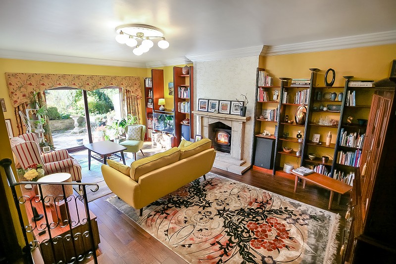Split-level area with solid oak flooring throughout, small wrought iron balustrade, double radiator, cornice moulded ceiling, fitted wall units, medieval-style reconstructed stone fireplace around cast-iron woodburning stove, double glazed patio doors to the rear forming a picture window over the westerly facing rear garden and countryside.