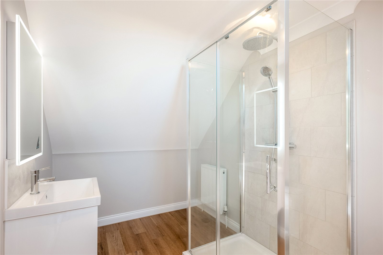 En-suite Shower Room Comprising of white suite of double shower cubicle, hand wash basin with vanity unit below, low level WC, wooden floor, double glazed Velux window to rear aspect.