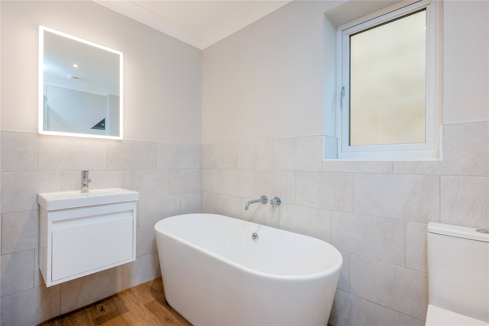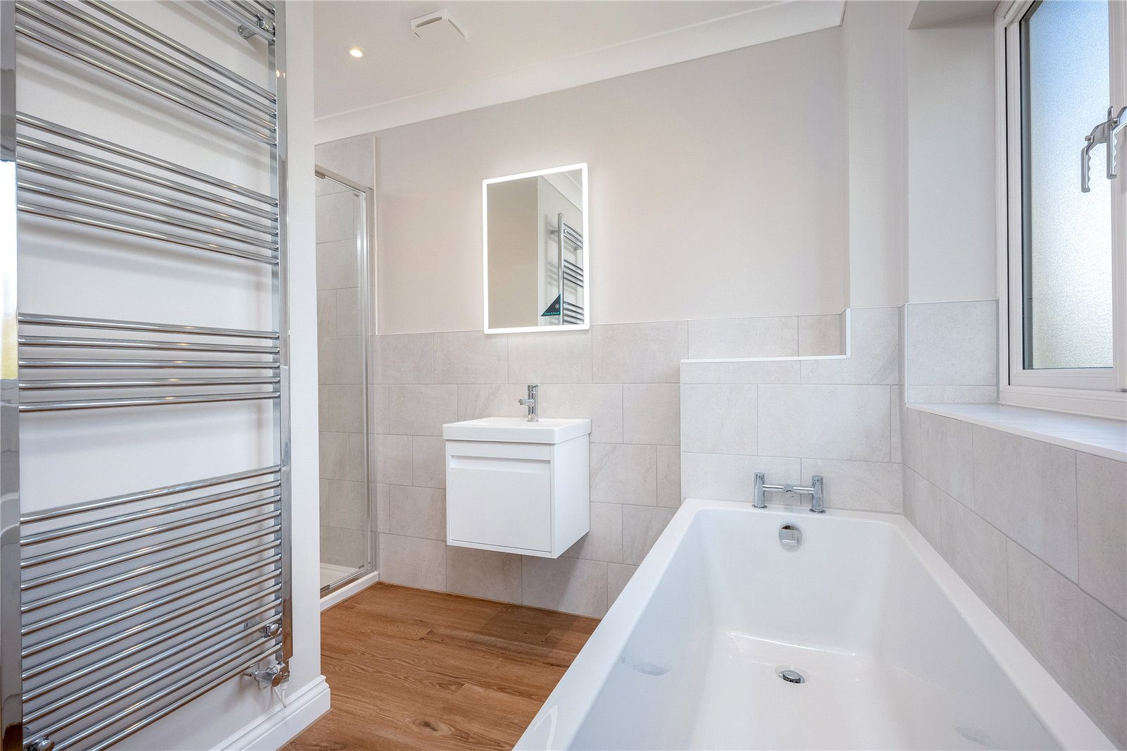 En-suite Bathroom Comprising of white suite of panelled bath, separate double walk-in shower with shower and rain shower over. Hand wash basin with vanity unit below, low level WC, part-tiled walls, wooden floor, double glazed window to rear aspect.