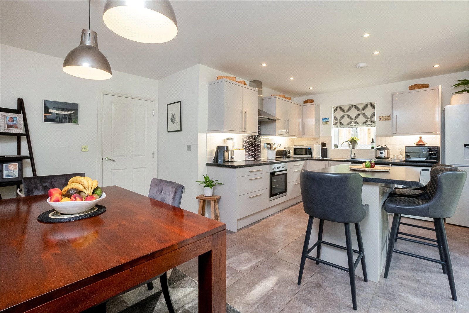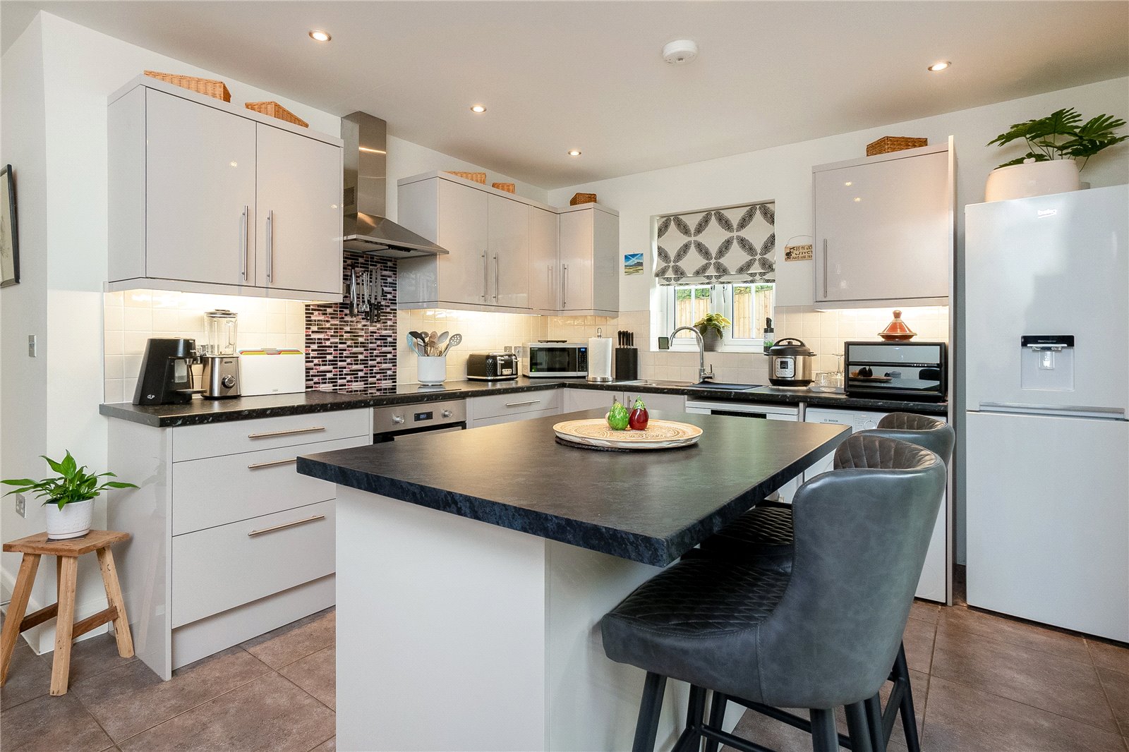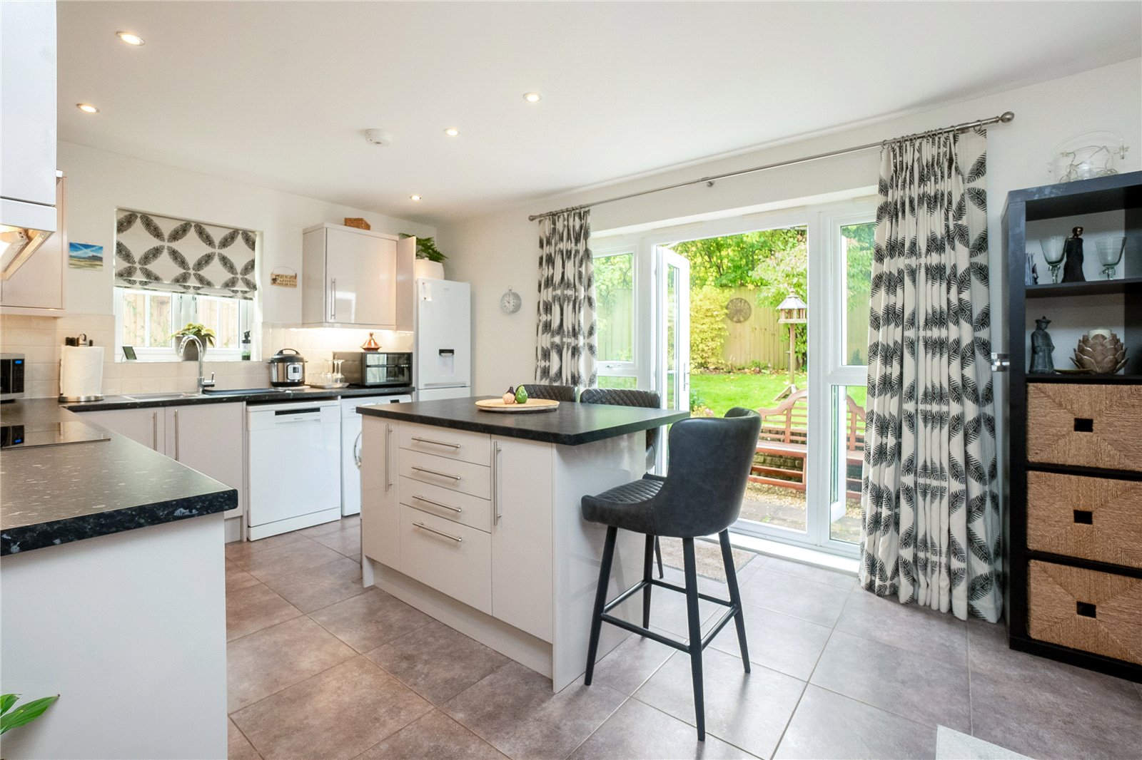 Kitchen/Breakfast Room: A spacious and versatile dining area, double glazed patio doors leading out to a west facing garden. Fully fitted kitchen with mounted wall and base units, integrated electric oven, four ring induction hob with extractor fan above, freestanding washing machine, dishawasher and fridge freezer, downlighting and central island.