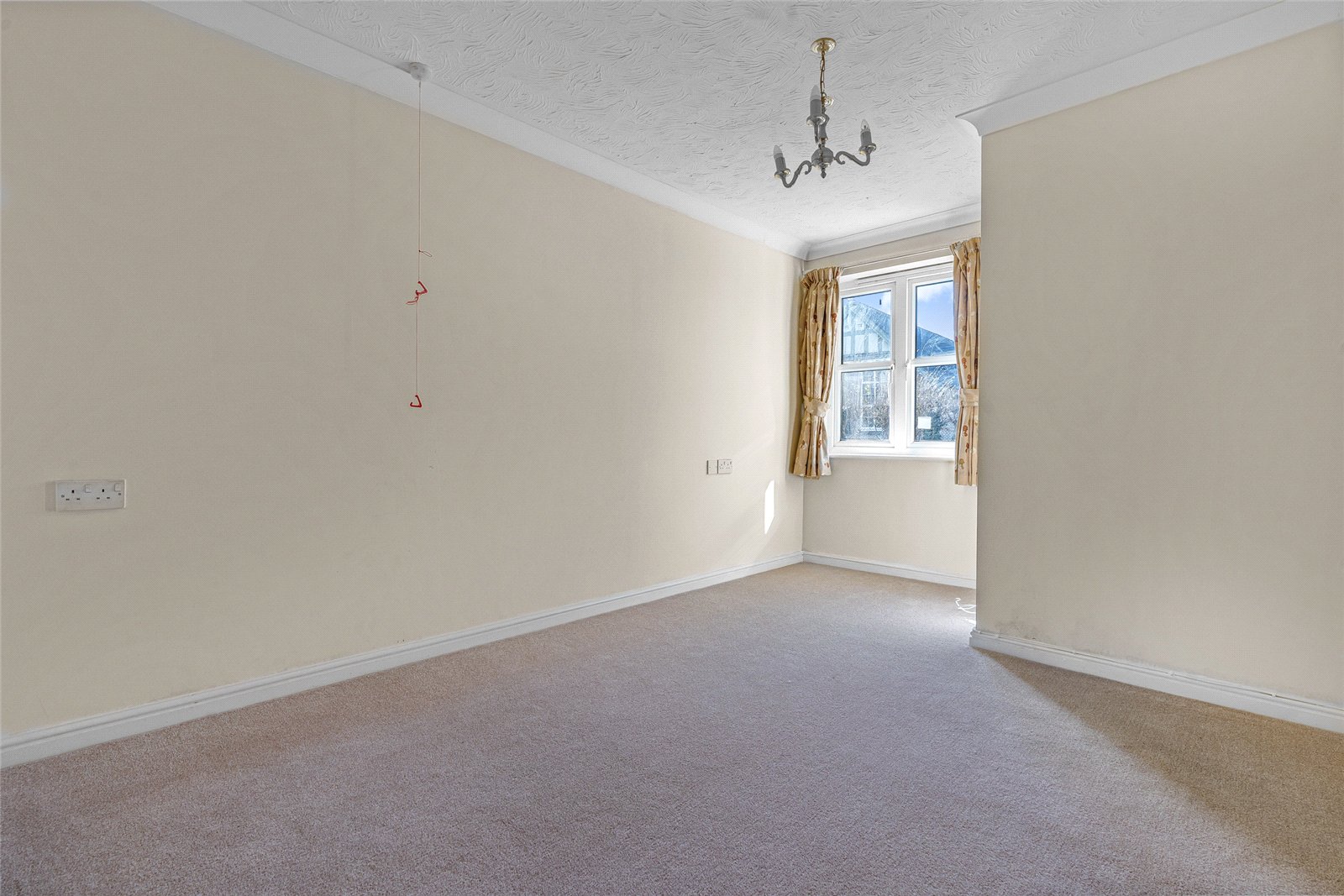 Kitchen: Double glazed window to front aspect, fitted kitchen with single drainer sink, electric hob, freestanding space for fridge, dishwasher, and electric oven.