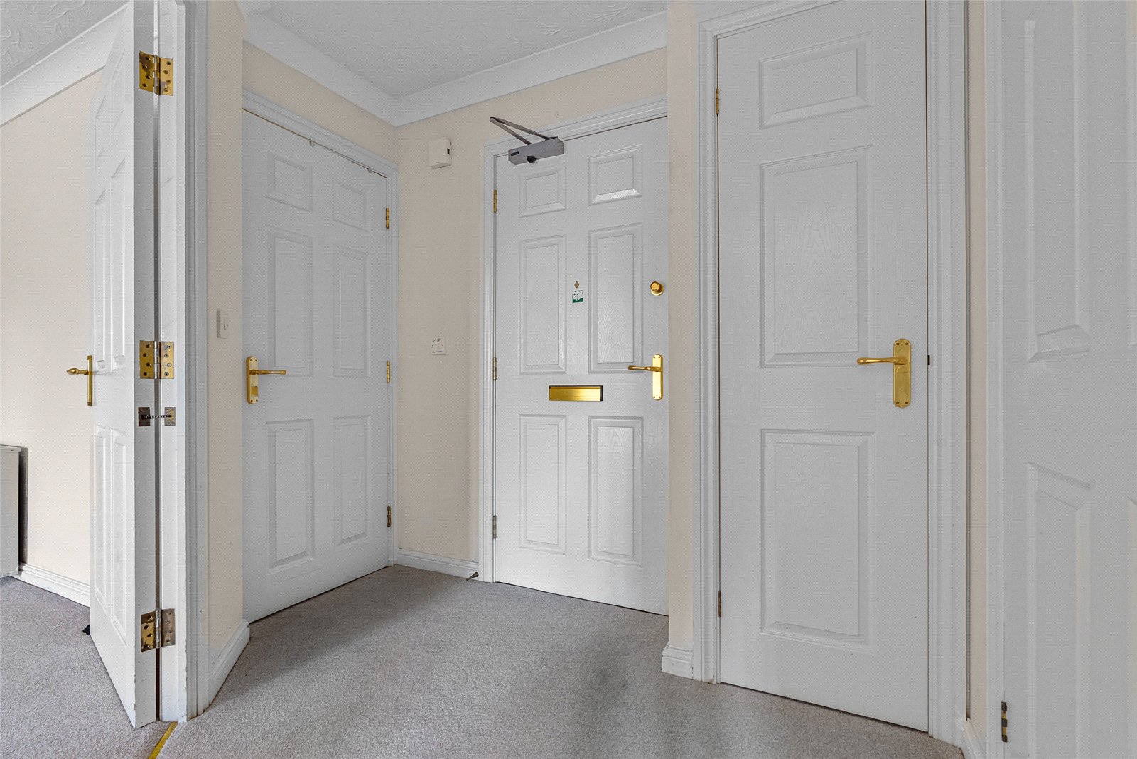 Front door leads into entrance hallway, with large storage cupboard which houses the central heating system, door to