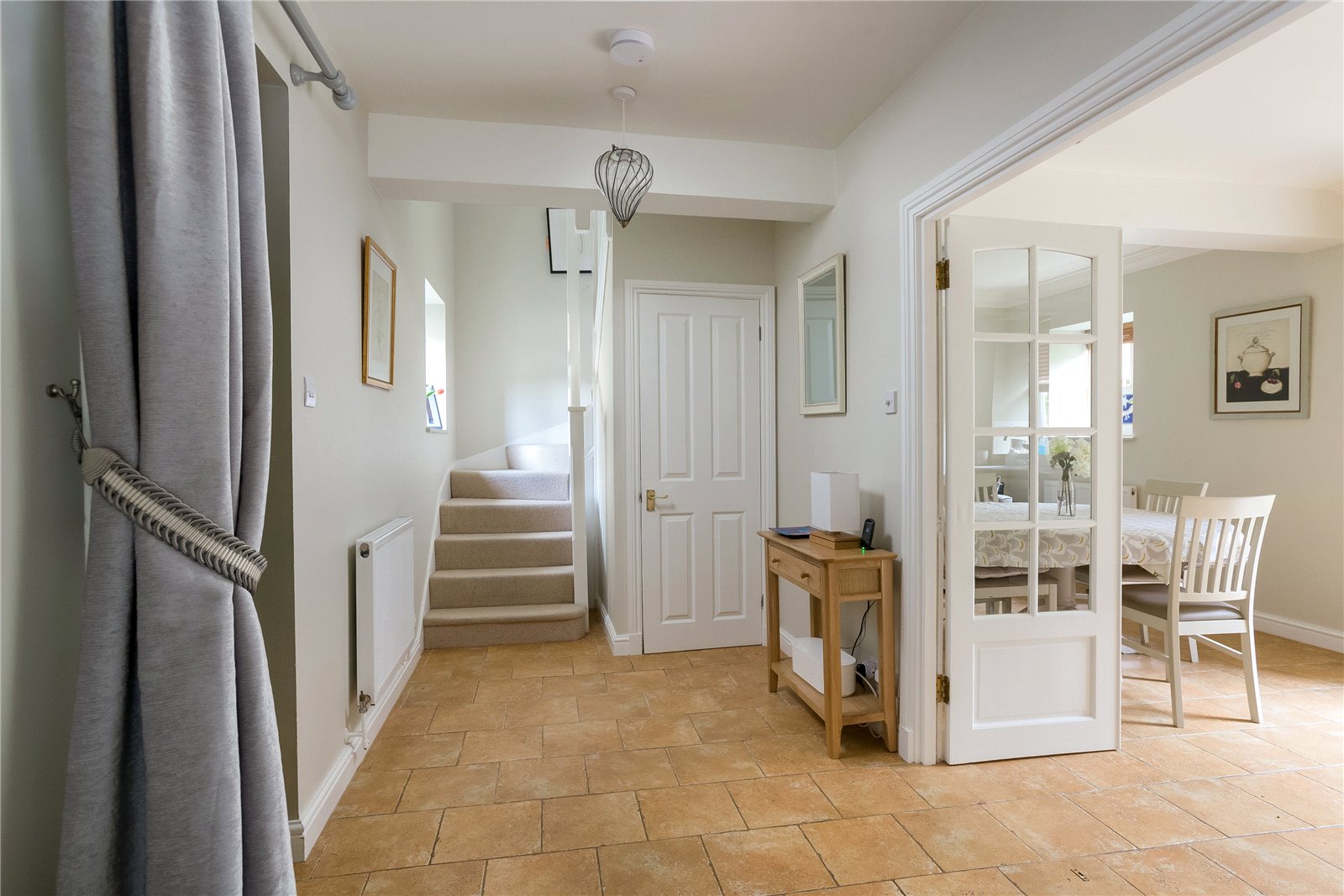 Spacious Entrance Hall, Stairs to First Floor Level with Understairs Cupboard, Tiled Floor, Double Glazed Window to Front Aspect, Part Glazed Double Doors to Kitchen/Dining Room