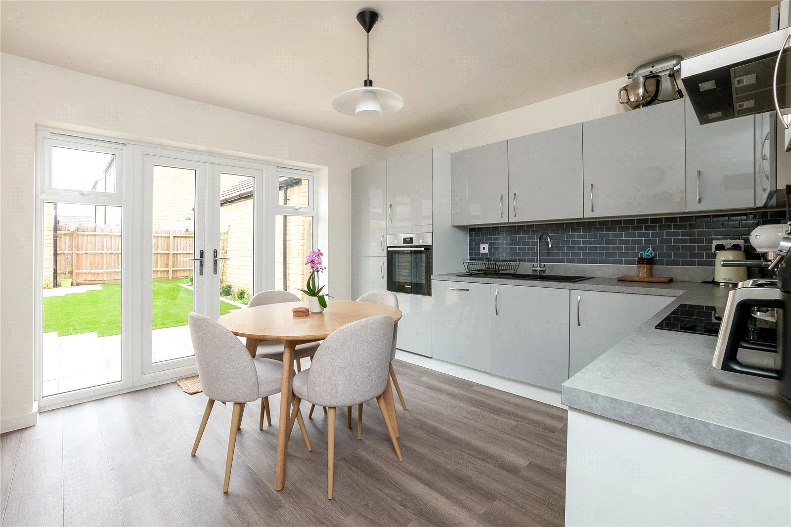 With a Range of Base and Wall Units with Integrated Oven and Hob with Extractor Over. French Doors Leading to Rear Garden.