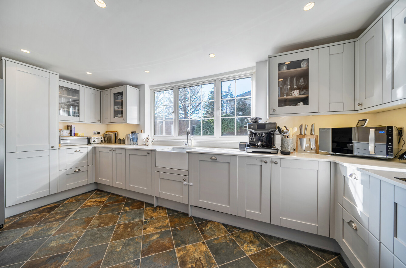 The kitchen is beautifully finished with Amtico flooring incorporating underfloor heating and fitted with an extensive range of Shaker-style units topped with quartz work surfaces and a breakfast bar. A butler sink, glass-fronted wall cabinets and a pleasant outlook over the rear garden add further character, with ample space for informal dining or casual seating. A separate utility room is conveniently located and accessible from both the kitchen and hallway.