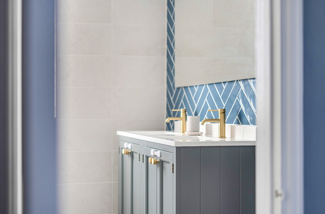 The family bathroom is stylishly appointed with brass fittings, a curved low-profile freestanding bath and basin set into a dark blue cabinet.