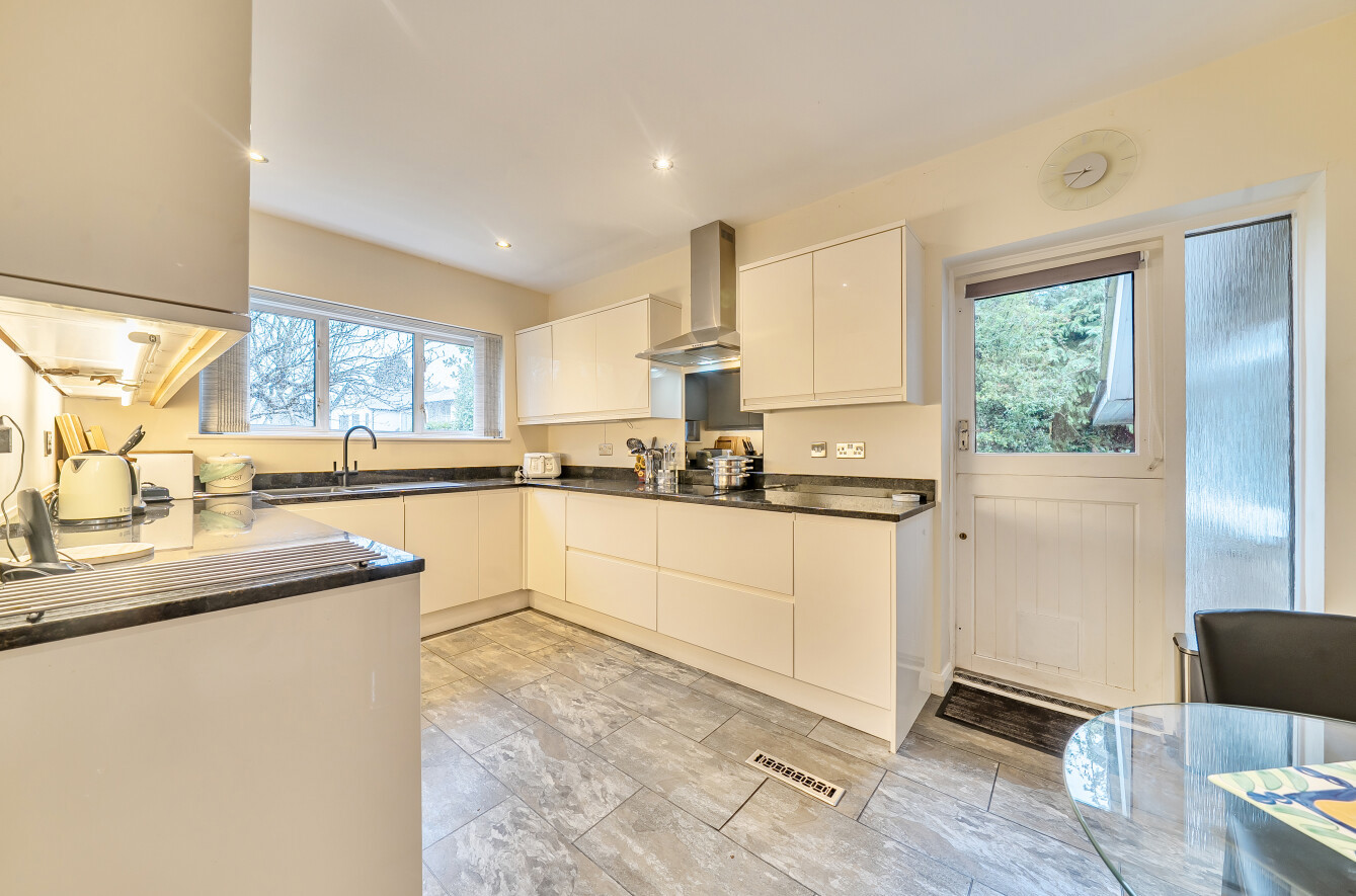The modern kitchen is very well fitted with a comprehensive range of sleek contemporary handleless gloss units with a contrasting granite work surface, and the appliances are integrated. There is space for a day-to-day dining table and a door to the outside.
