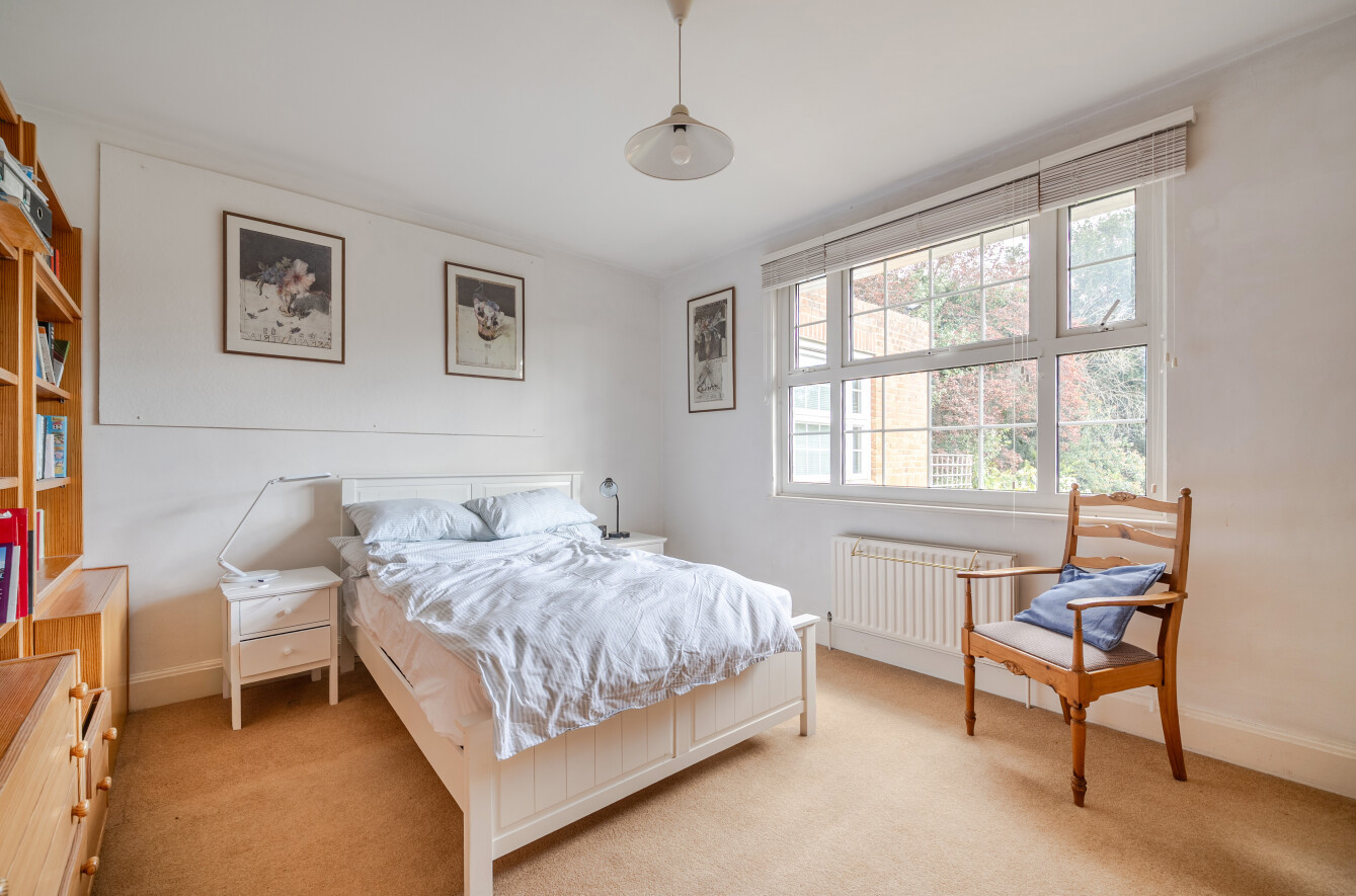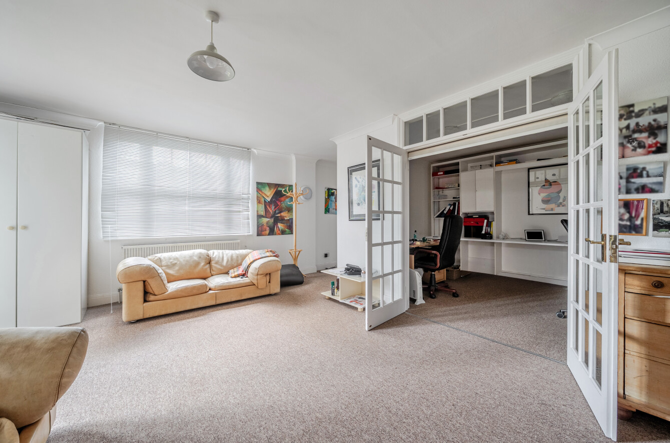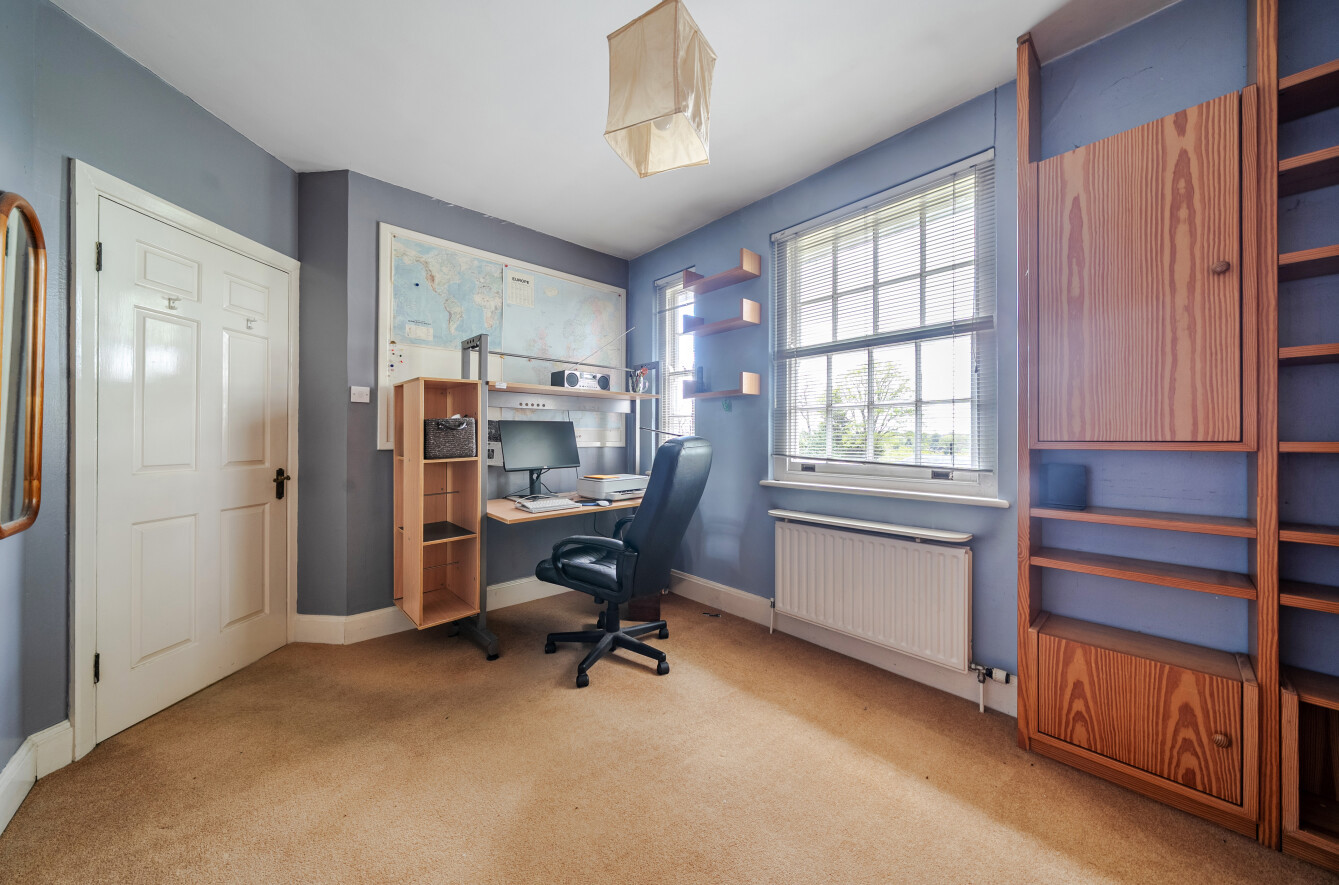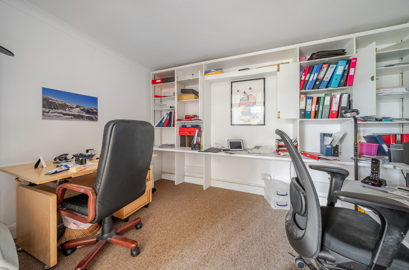 The principal bedroom includes an additional inner room, currently used as a home office, along with double doors opening onto a terrace, providing access to the garden or a peaceful space to enjoy the outlook.