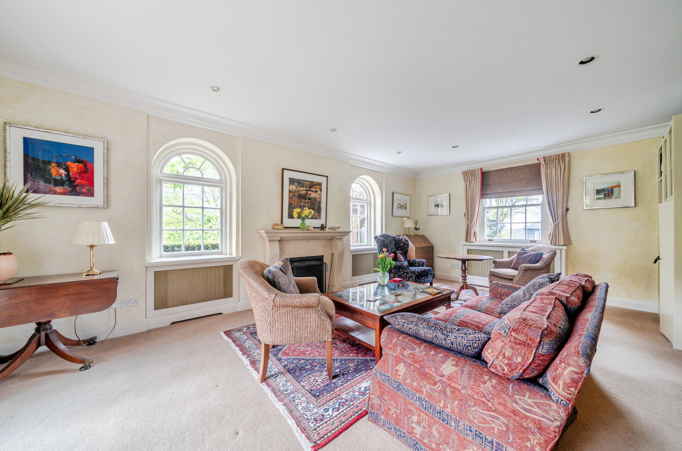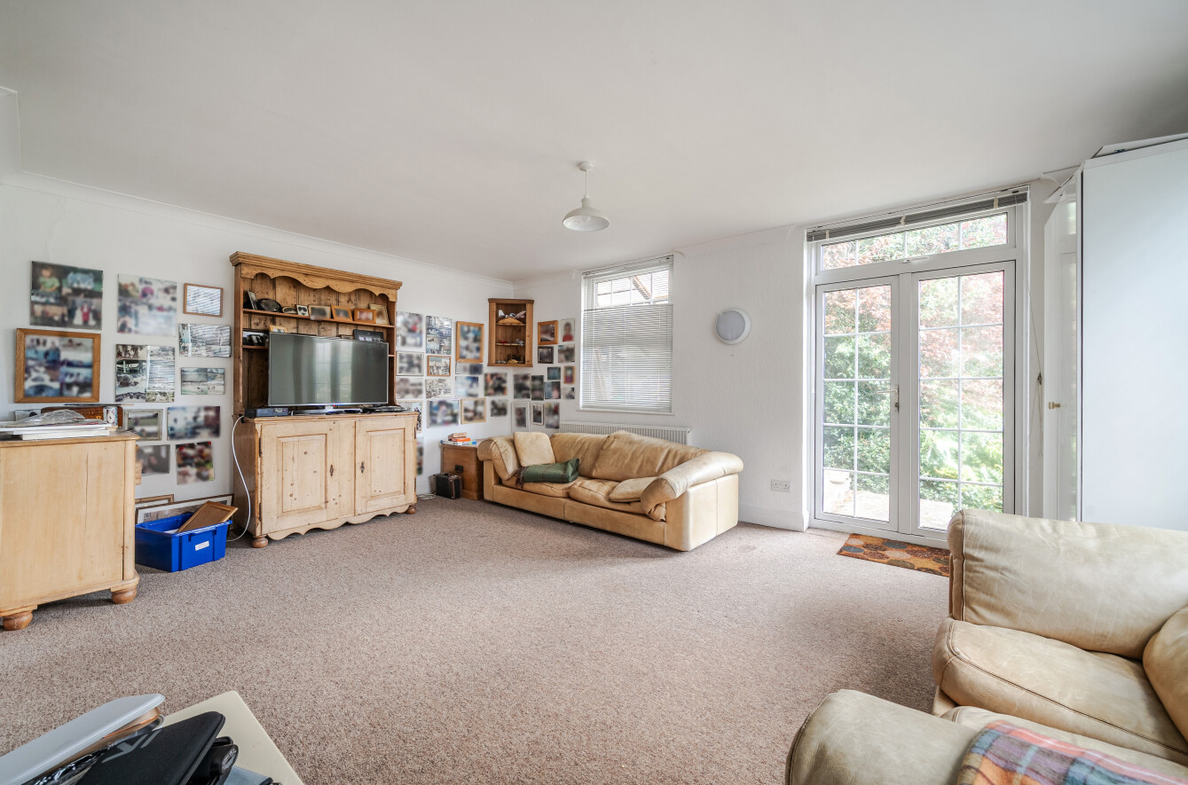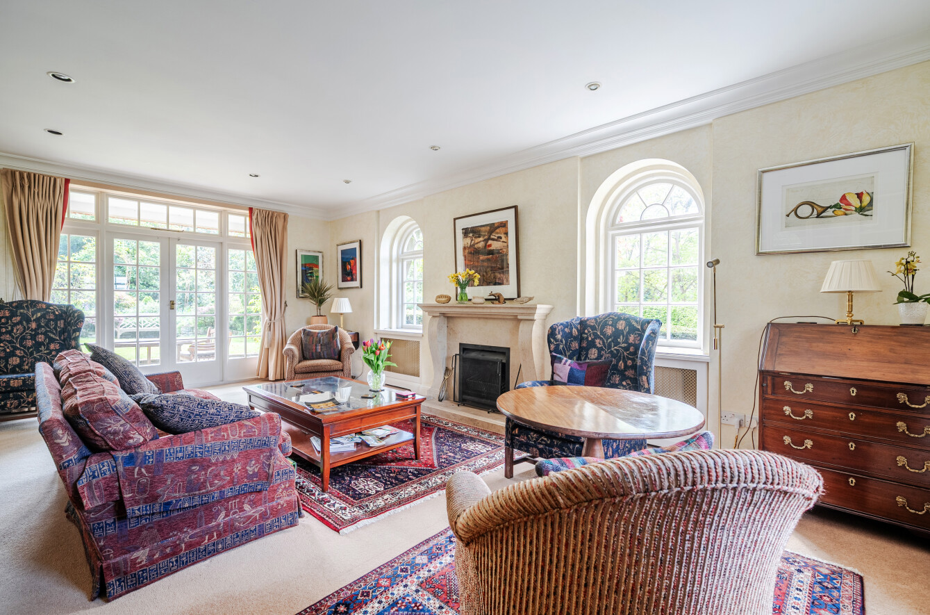 The formal living room extends to approximately 335 sq ft and features detailed cornicing and two beautiful arched windows flanking a stone fireplace, creating a striking focal point. A further front-facing window, together with wide glazed French doors opening onto the garden, ensures the room is filled with natural light throughout. The patio here is perfectly positioned to enjoy the morning sun with the sun remaining in the garden through the day.
