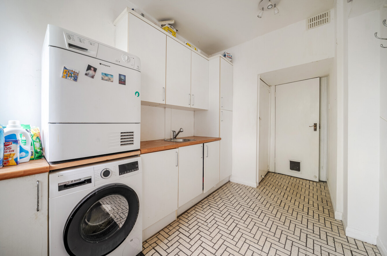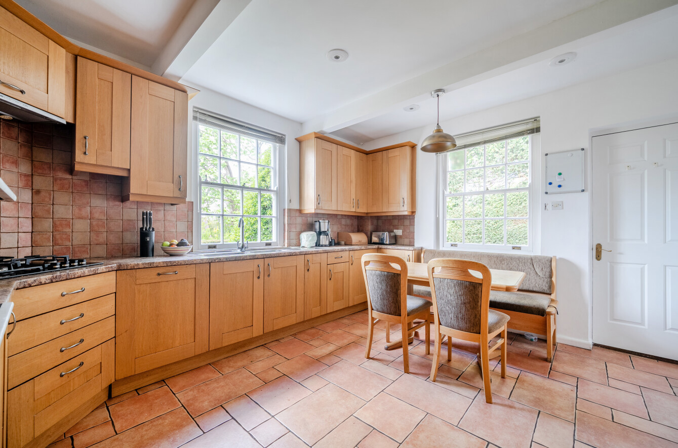 The double-aspect kitchen comprises a comprehensive range of wooden Shaker-style wall and base units with granite work surfaces and integrated appliances. There is space for casual dining, and a door leads to a fitted utility room with access to both the large garage and the exterior.