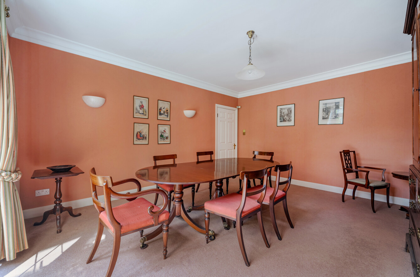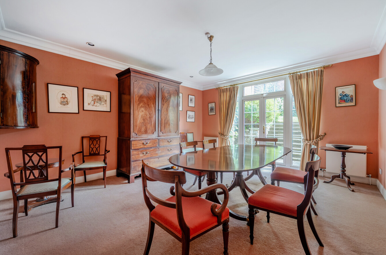 A well-proportioned dining room sits to the rear of the property, enhanced by elegant cornicing and accent-painted walls that add warmth and depth. French doors open directly onto the rear patio and garden.