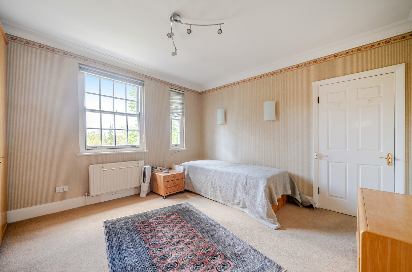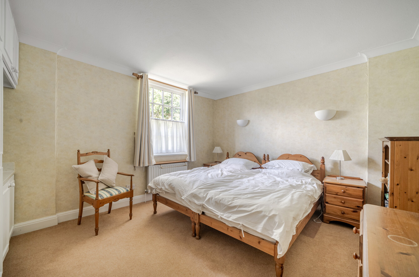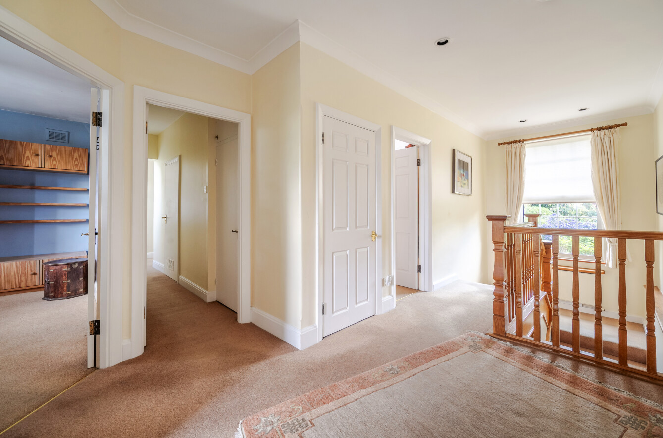 All six bedrooms are located on the first floor, accessed via an attractive oak staircase rising to a large, bright landing flooded with natural light from a feature window. Each bedroom is a double, with some benefiting from built-in wardrobes and wash basins.