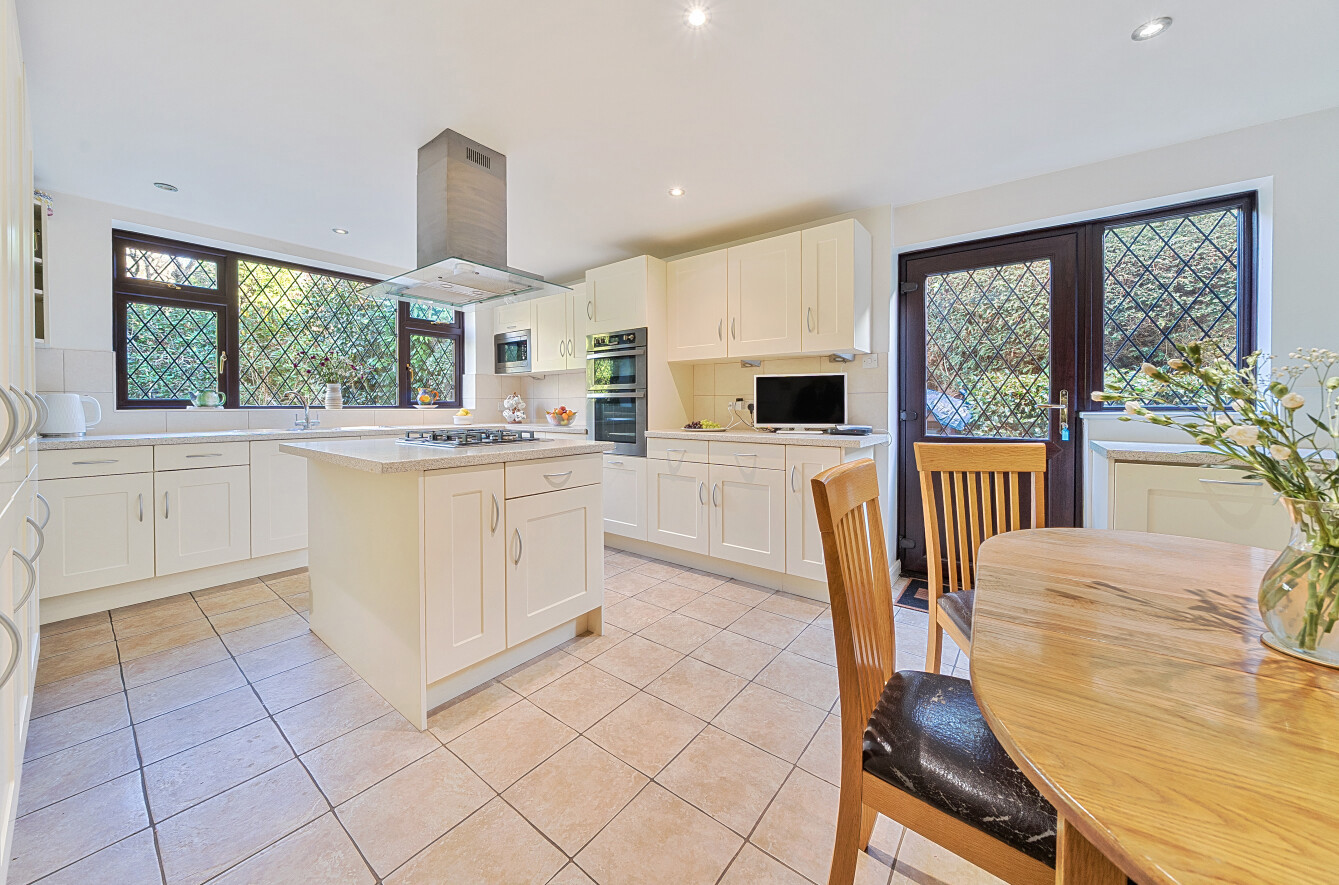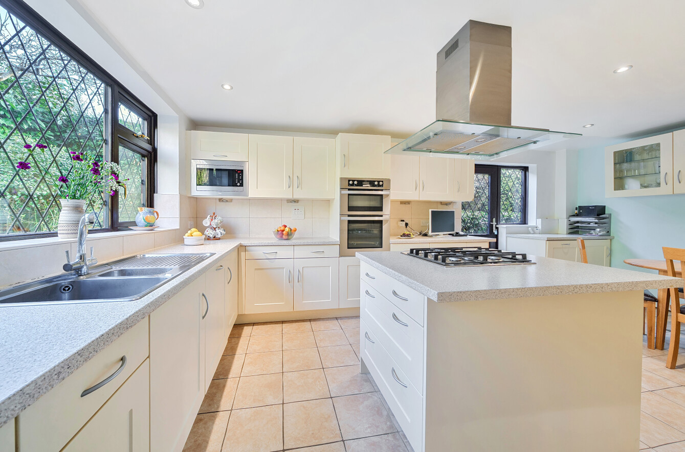 The kitchen offers an extensive range of cream Shaker-style floor, wall, and full-height cabinets, complemented by a central island with an extended surface forming a breakfast bar. The room is filled with natural light from a large rear-facing window and a glazed side door. There is ample space for dining furniture and access to the utility room, which also has a door to the outside.