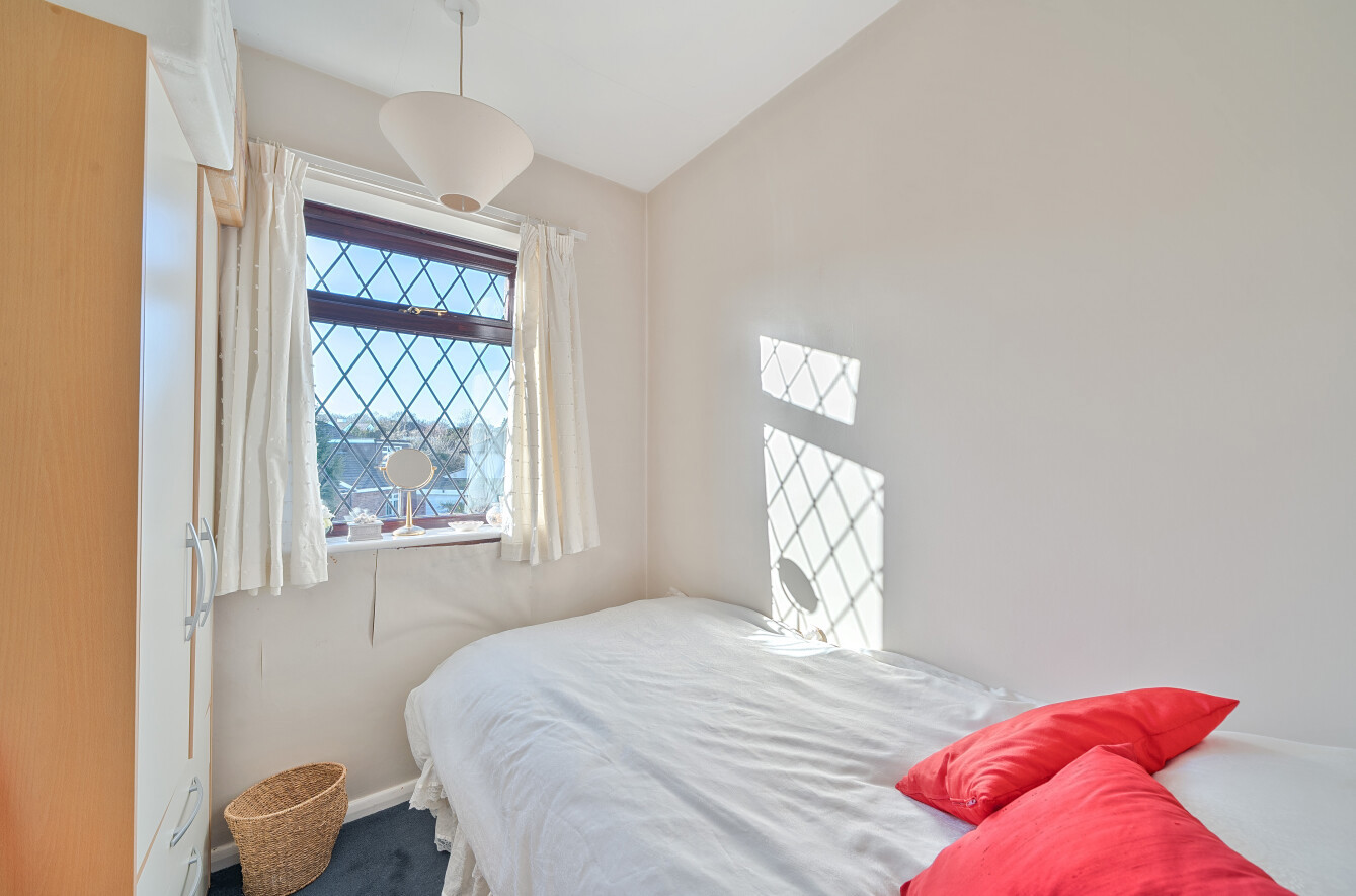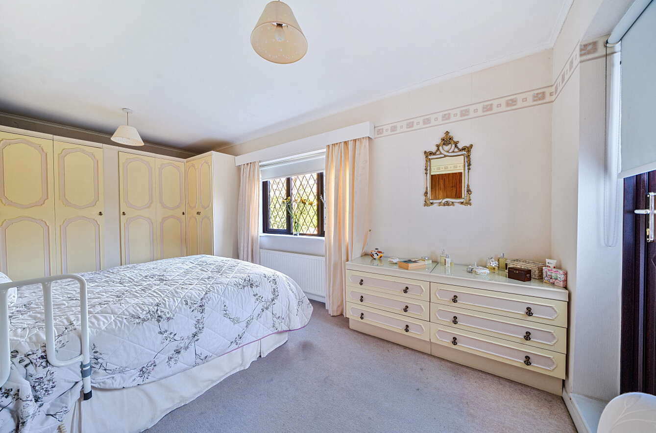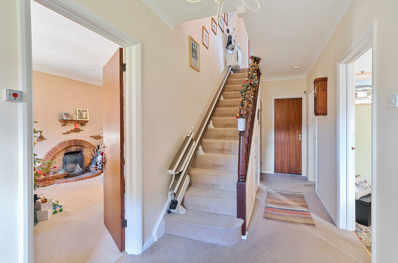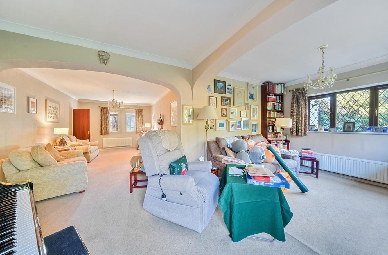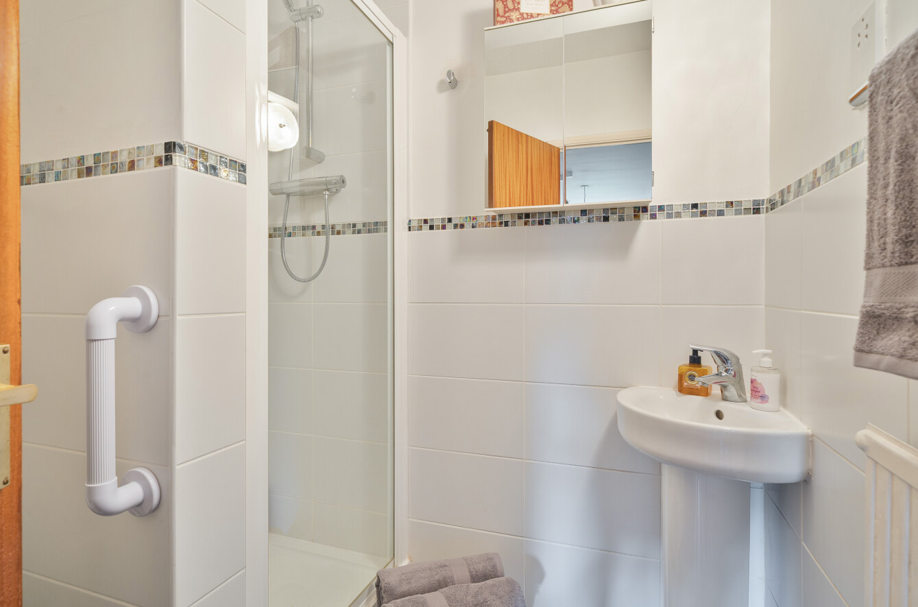 On entering, a welcoming hallway with understairs storage leads to a useful ground floor shower room. The 614 sq ft sitting room is a spacious L-shaped room with ample space for lounge furniture set around the feature brick fireplace to the front. An archway leads to the rear section, currently accommodating a grand piano and additional seating, arranged to enjoy views of the garden through the patio doors.