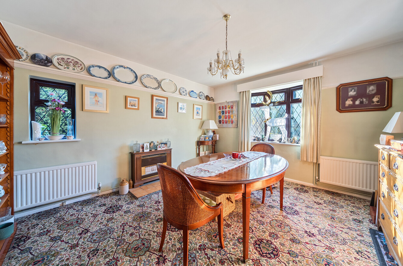 A separate double-aspect dining room features a bay window to the front, and a further room accessed from the garden is currently used as a home office.