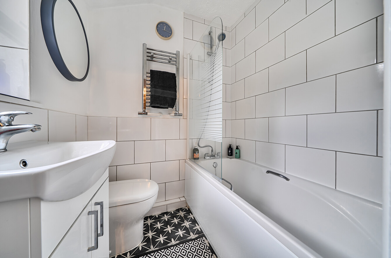 Also on the ground floor is the bathroom which is contemporary in style and features a white suite, chrome heated towel rail, part tiled walls and dark grey and white geometric floor tiles. A window provides natural light and ventilation.