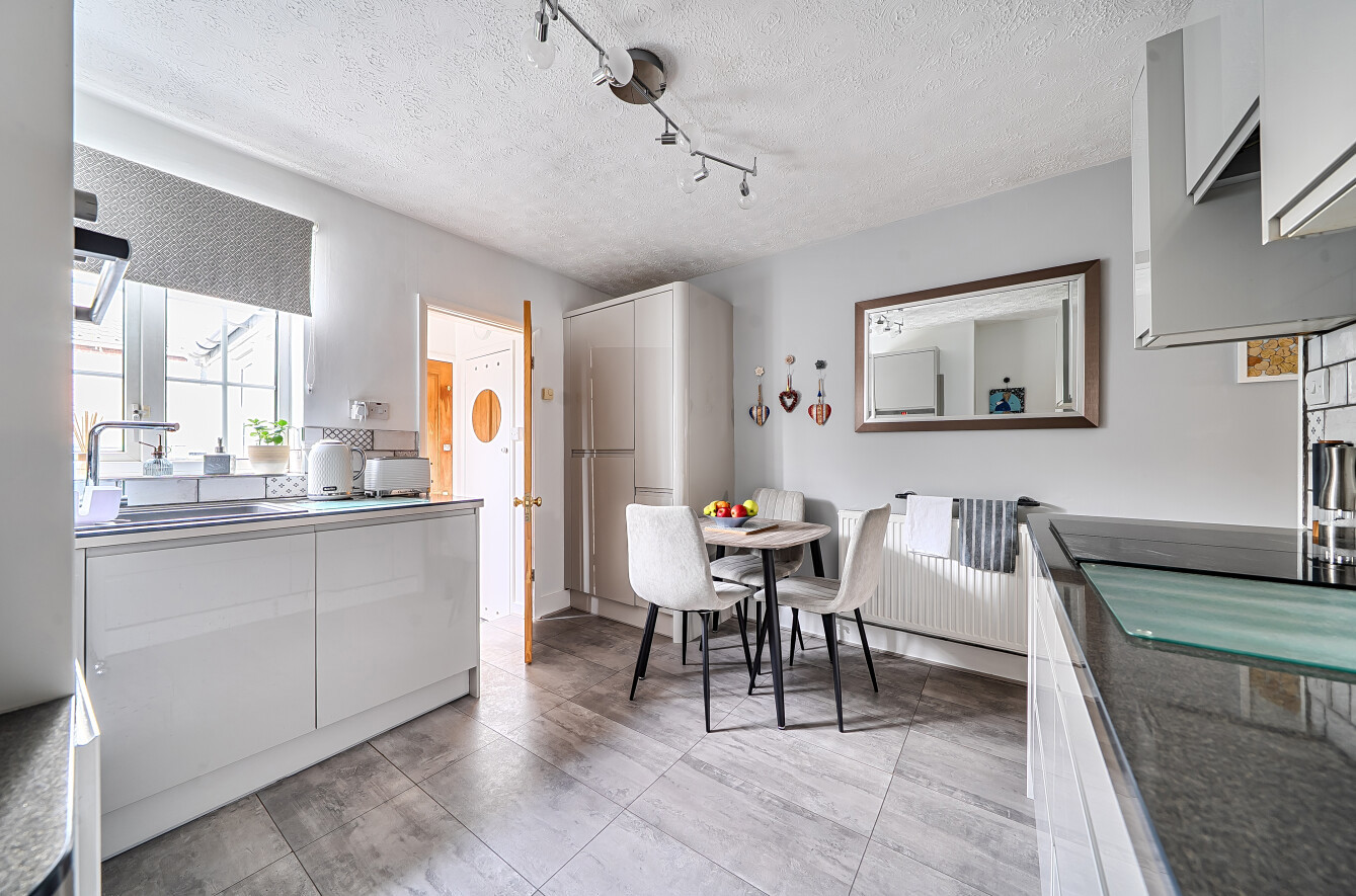 Entry to the property is via the reception room which leads through to the kitchen/dining room. The kitchen is fitted with a good range of light grey high gloss wall and base cabinets, integrated appliances and space for a dining table and chairs. There is subway style tiling to one of the walls and the flooring is grey wood effect laminate. A window provides a pleasant view of the garden.