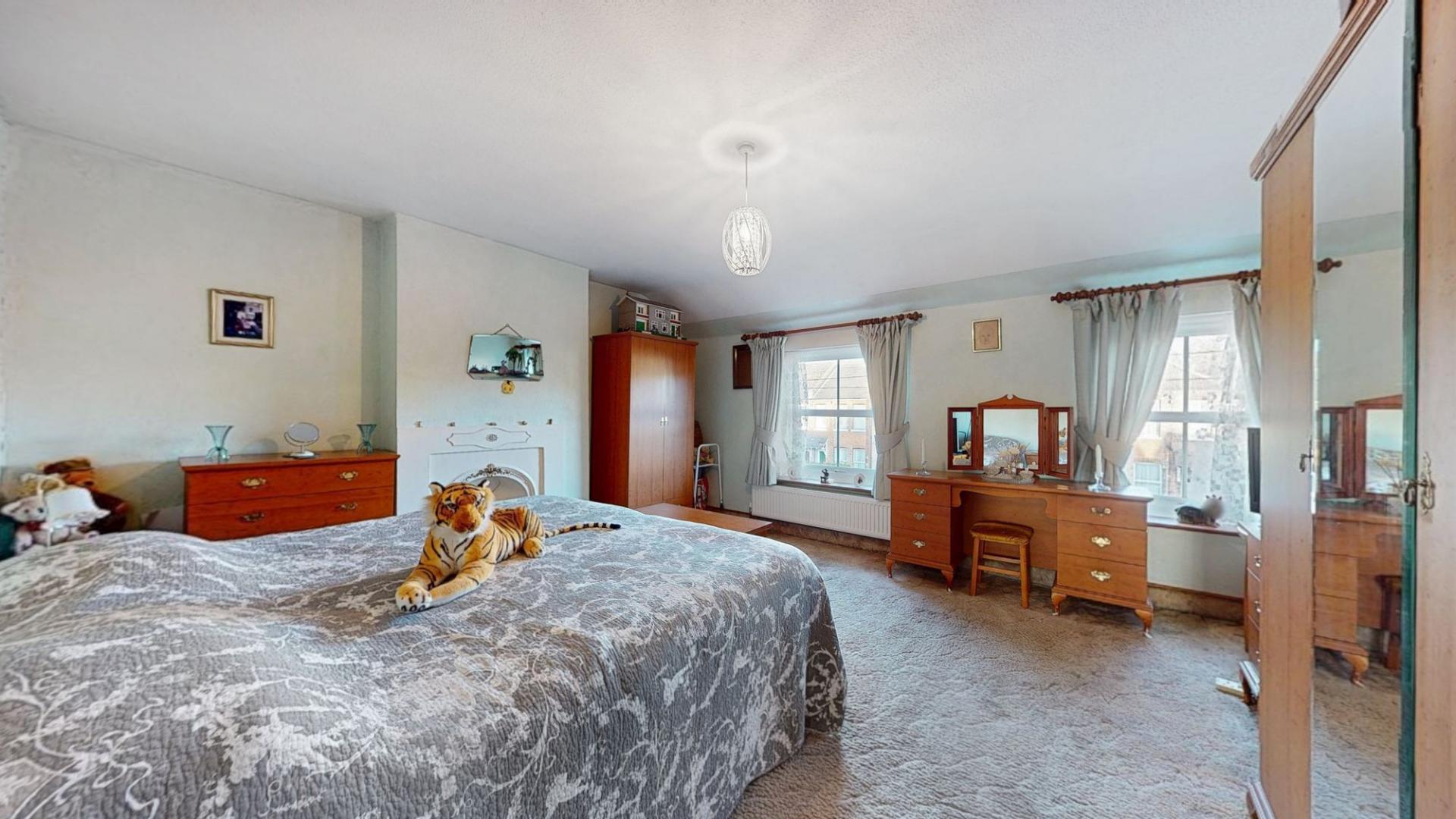 Features include a bay-fronted living room with fireplace, dining room with fireplace, contemporary kitchen with integrated appliances and quartz worktops, ground floor bathroom, first floor WC and loft access. The main bedroom is generously sized, while the second bedroom benefits from a separate dressing room with WC.