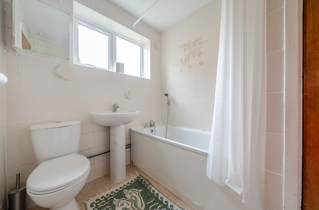 The bathroom comprises a white suite including bath and pedestal basin, along with a built-in cupboard and mirrored wall cabinet. A window provides both ventilation and natural light.