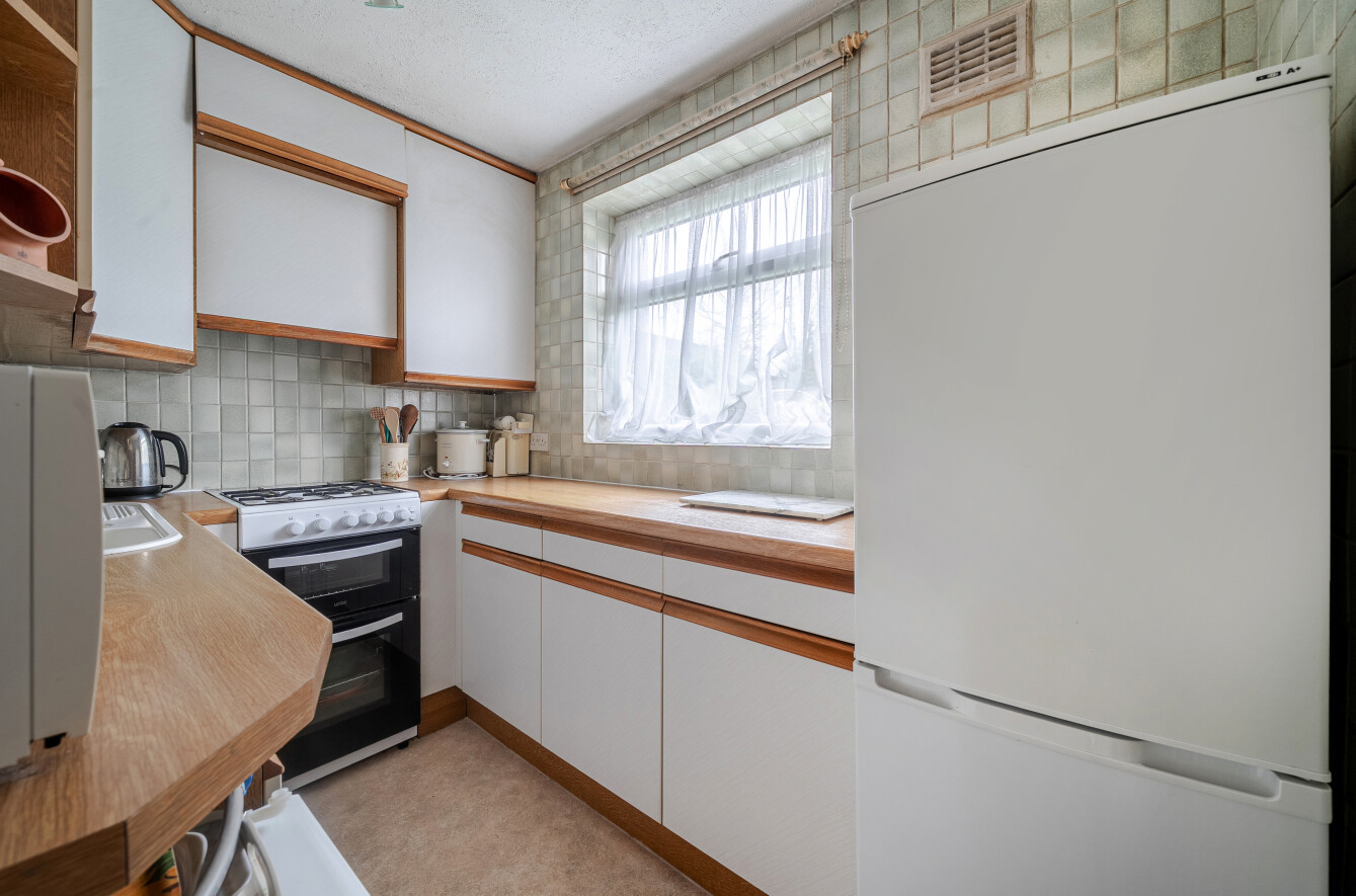 The kitchen is accessed from the reception room and offers a range of fitted wall and base units with a window to the front.