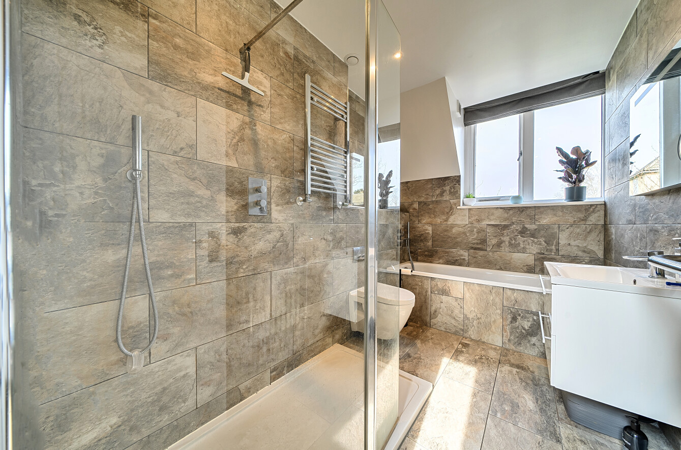 To the first floor are four well-proportioned double bedrooms, some with fitted wardrobes, served by a fully tiled luxury family bathroom. The bathroom includes a walk-in shower, separate bath, wash basin set within a vanity unit with mirrored storage above, and a window providing natural light and ventilation.