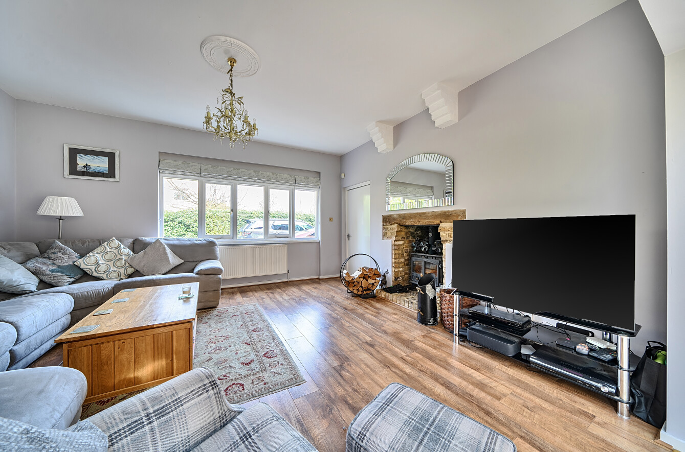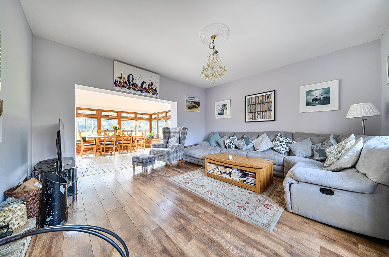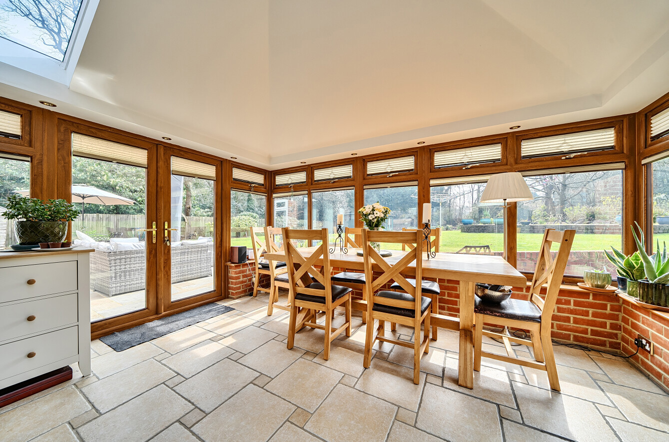 The principal reception room measures approximately 274 sq ft and is centred around a log-burning fireplace with decorative corbels above. This space flows seamlessly into the conservatory dining room, offering beautiful views across the garden.