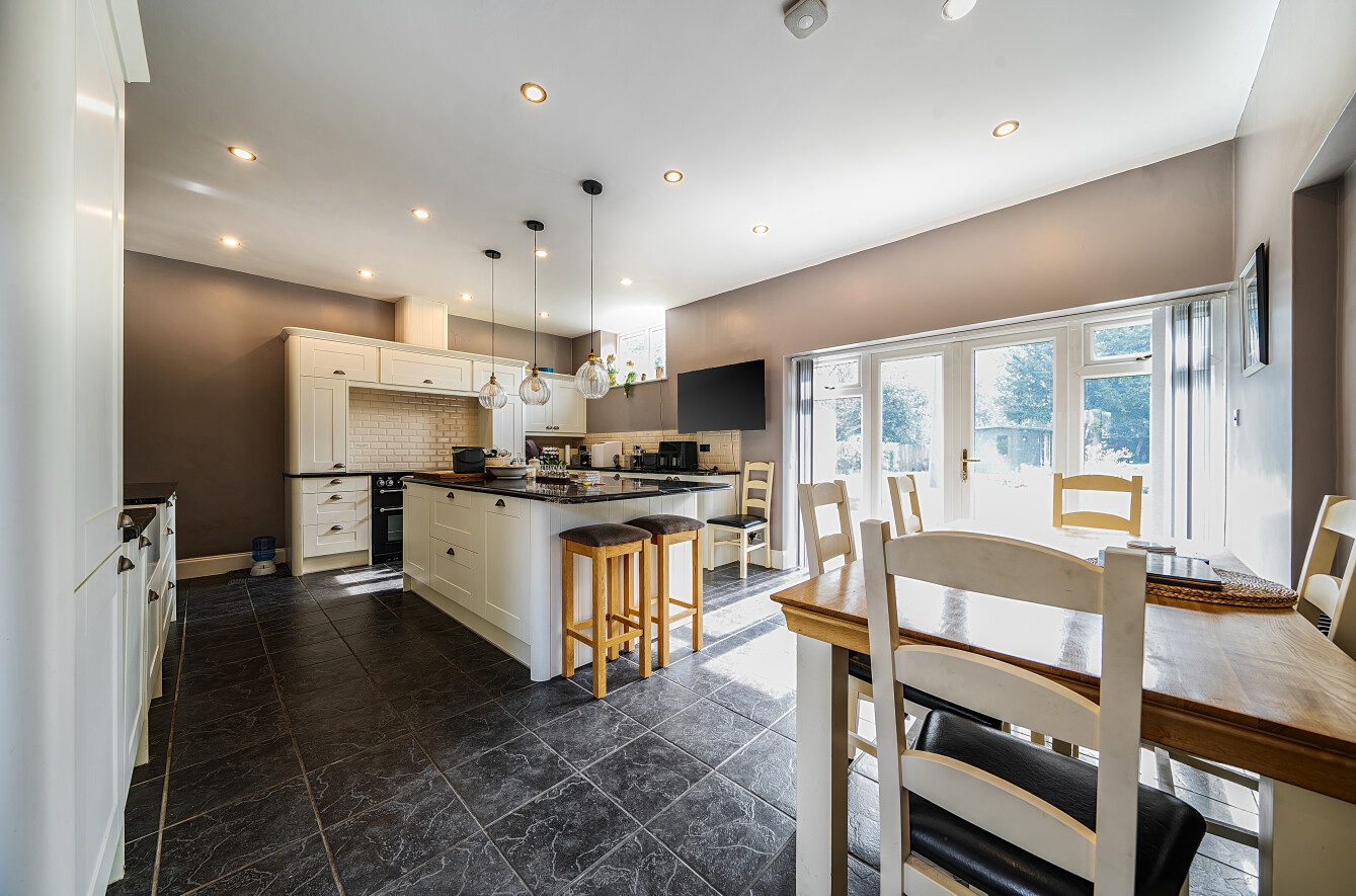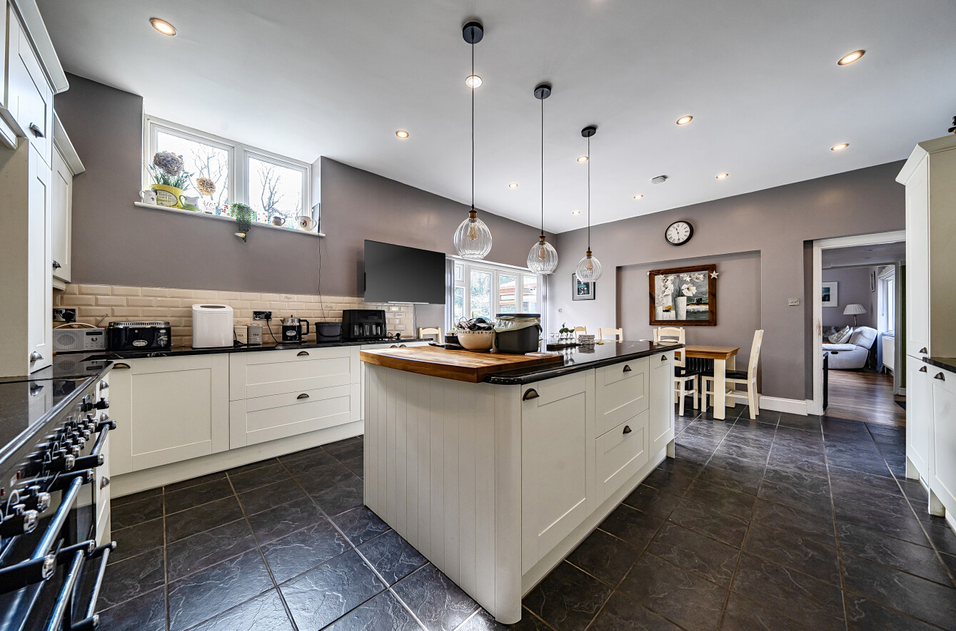 At the heart of the home is a generous kitchen with separate cooking and dining areas, forming a true day-to-day hub. Double doors open directly onto the magnificent garden. Features include shaker-style cream cabinetry, contrasting black granite worktops, an inset butcher’s block, a range cooker set within an inglenook recess, and attractive tiled finishes throughout.