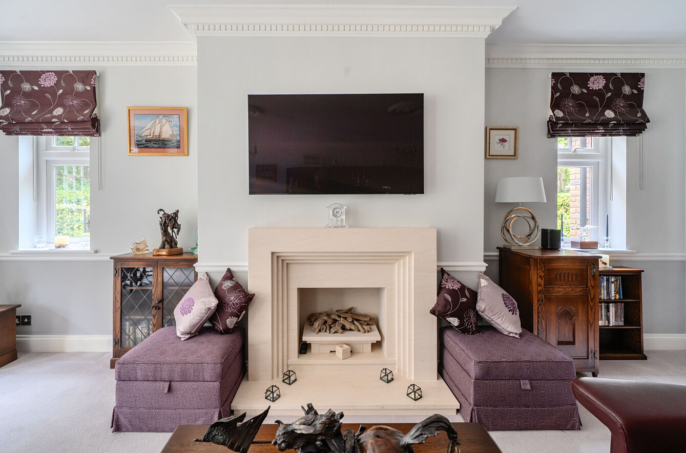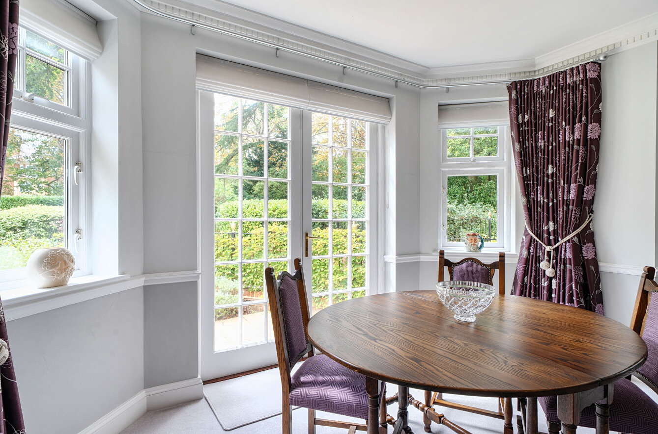 The triple aspect sitting room is an expansive 521 sq ft centred around a stone fireplace, with attractive ceiling roses and a deep bay incorporating French doors out to a private patio and communal grounds. Generously proportioned, the space easily accommodates lounge seating, storage furniture and a dining suite. Bespoke window dressings, included throughout the apartment, add a luxurious finishing touch.