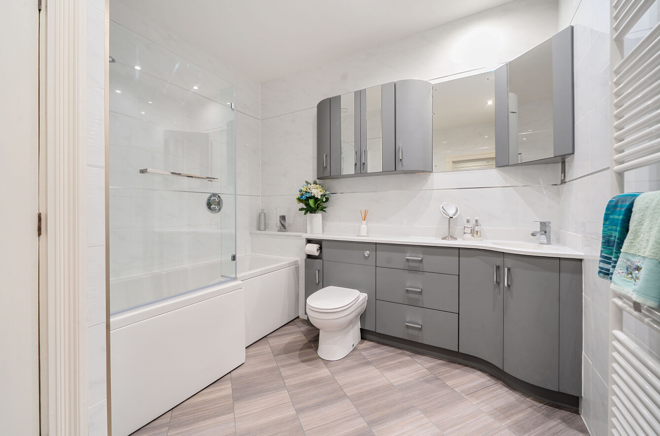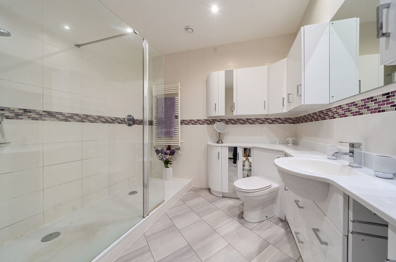 Both bedrooms are double. The principal suite features a wall of fitted wardrobes and a luxury en suite shower room fitted with quality cabinetry and a heated towel radiator. The second bedroom is served by a separate bathroom with bath and overhead shower, vanity storage, inset basin, and heated towel radiator.