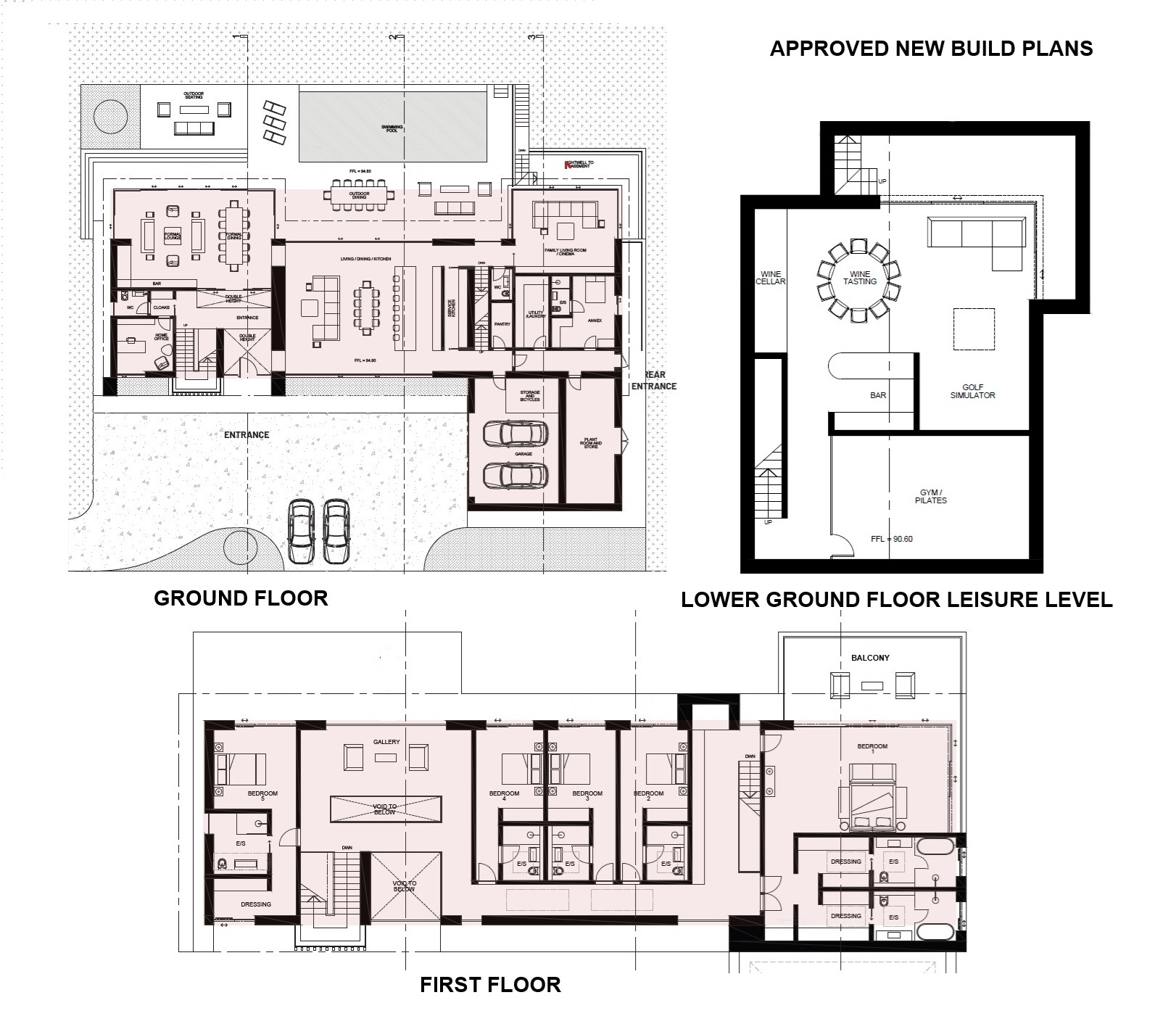 The plans show a wealth of ground floor reception space including formal, informal and outdoor lounge and dining areas by the swimming pool, a home office and a large main kitchen with a secondary service kitchen as well.