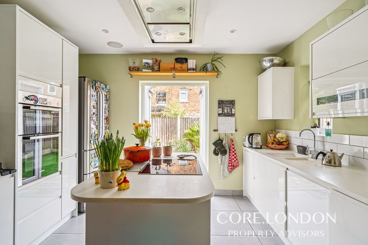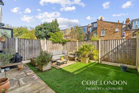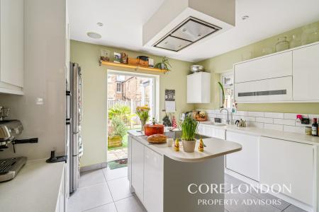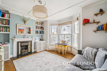 To the front, there is a bay-fronted reception room with a number of original features including coving, ceiling detail and a period fireplace. To the rear, a spacious kitchen dining room has been designed with good storage and integrated appliances, with double doors opening onto a low-maintenance garden. There is clear potential to extend into the side return, as many neighbouring houses have done, subject to the usual consents.
