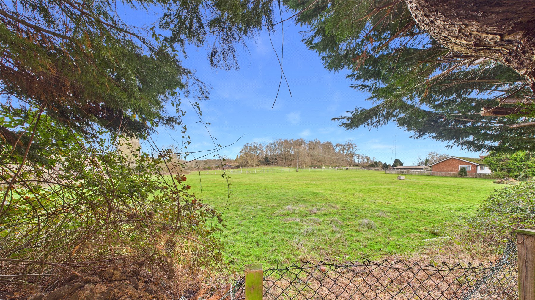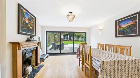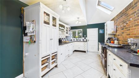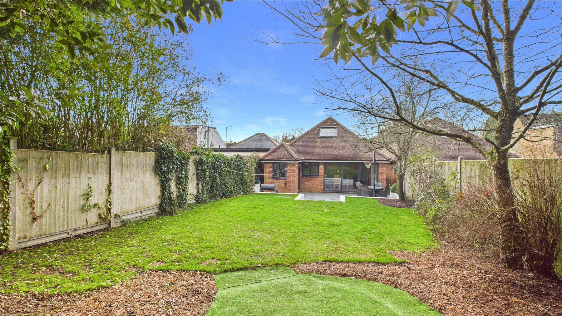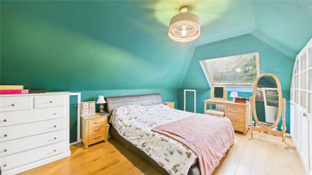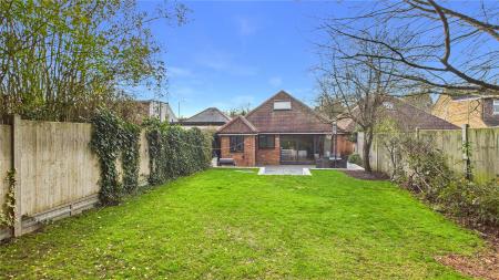 A beautifully presented four bedroom, two bathroom detached chalet bungalow, tucked away in a peaceful Chobham village setting and enjoying open views over neighbouring fields to the rear.The property is approached via an attractive oak-framed porch, with the front door opening into a welcoming central hallway providing access to the ground floor accommodation and stairs rising to the first floor.The heart of the home is the impressive open-plan living and dining space, accessed via double doors and featuring a central fireplace as a focal point. Bi-folding doors open seamlessly onto the rear patio, creating an ideal environment for both entertaining and day-to-day family living.The kitchen is fitted with a comprehensive range of wall and base units with work surfaces over, complemented by an Aga and space for additional appliances. A rear aspect window overlooks the garden, while the vaulted ceiling with skylight windows enhances the sense of space and natural light. A door leads through to a useful utility room offering further storage and worktop space.There are two bedrooms located on the ground floor. The principal ground floor bedroom is a generous double with extensive walk-in wardrobe space and a front aspect window. The second room is currently utilised as a study but offers excellent flexibility as a further bedroom or reception room. A well-appointed four-piece family bathroom completes the ground floor, comprising a freestanding bath, separate shower cubicle, vanity basin and WC.To the first floor are two further double bedrooms, both benefitting from fitted storage and large Velux windows. These rooms are served by a recently updated shower room, providing modern finishes and adding to the overall practicality of the layout.Outside, the rear garden has been thoughtfully landscaped, featuring a generous patio area ideal for outdoor entertaining, steps leading to a well-proportioned lawn, and mature planting providing a high degree of privacy while enjoying open countryside views beyond.To the front, the property offers ample driveway parking for several vehicles, enclosed by attractive walled boundaries.