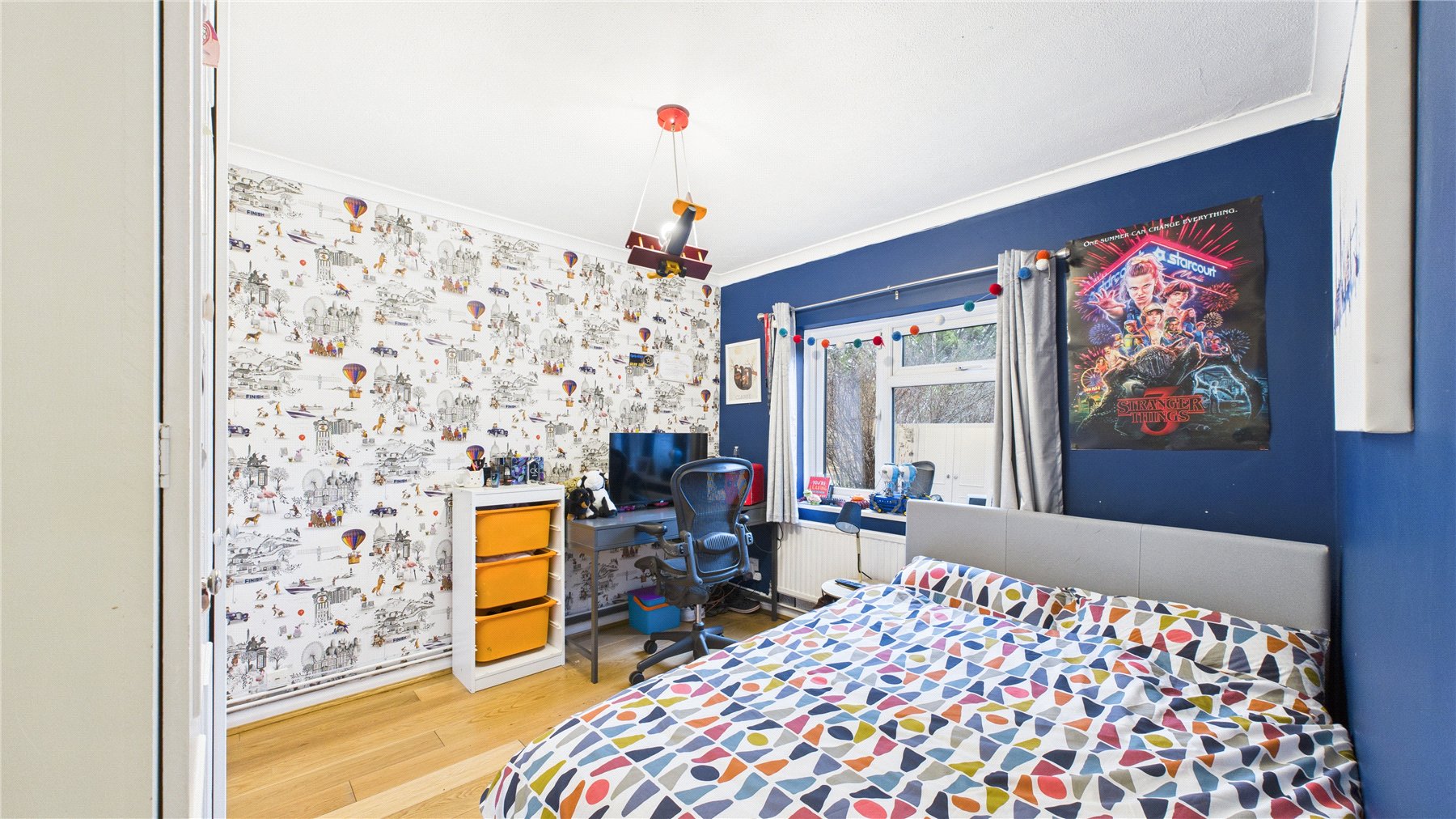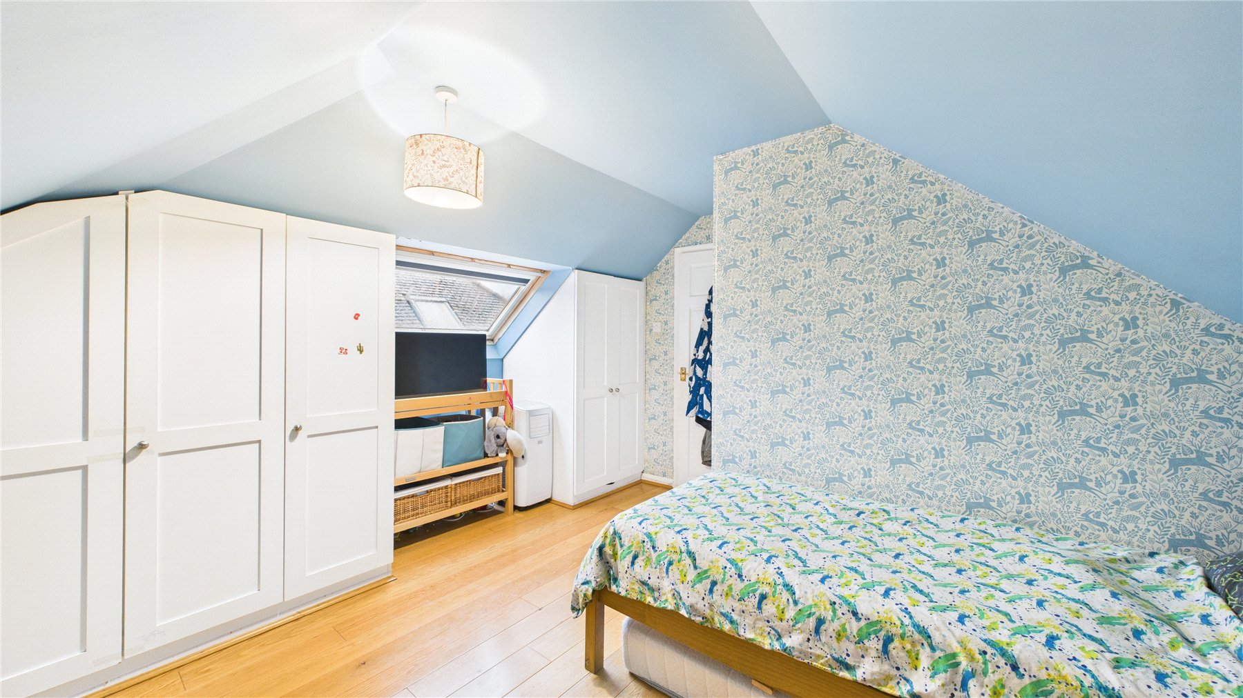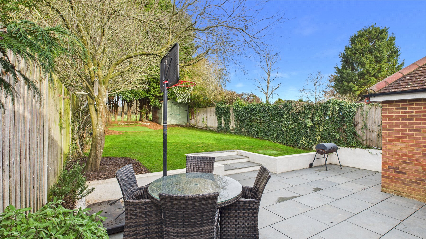 A beautifully presented four bedroom, two bathroom detached chalet bungalow, tucked away in a peaceful Chobham village setting and enjoying open views over neighbouring fields to the rear.The property is approached via an attractive oak-framed porch, with the front door opening into a welcoming central hallway providing access to the ground floor accommodation and stairs rising to the first floor.The heart of the home is the impressive open-plan living and dining space, accessed via double doors and featuring a central fireplace as a focal point. Bi-folding doors open seamlessly onto the rear patio, creating an ideal environment for both entertaining and day-to-day family living.The kitchen is fitted with a comprehensive range of wall and base units with work surfaces over, complemented by an Aga and space for additional appliances. A rear aspect window overlooks the garden, while the vaulted ceiling with skylight windows enhances the sense of space and natural light. A door leads through to a useful utility room offering further storage and worktop space.There are two bedrooms located on the ground floor. The principal ground floor bedroom is a generous double with extensive walk-in wardrobe space and a front aspect window. The second room is currently utilised as a study but offers excellent flexibility as a further bedroom or reception room. A well-appointed four-piece family bathroom completes the ground floor, comprising a freestanding bath, separate shower cubicle, vanity basin and WC.To the first floor are two further double bedrooms, both benefitting from fitted storage and large Velux windows. These rooms are served by a recently updated shower room, providing modern finishes and adding to the overall practicality of the layout.Outside, the rear garden has been thoughtfully landscaped, featuring a generous patio area ideal for outdoor entertaining, steps leading to a well-proportioned lawn, and mature planting providing a high degree of privacy while enjoying open countryside views beyond.To the front, the property offers ample driveway parking for several vehicles, enclosed by attractive walled boundaries.