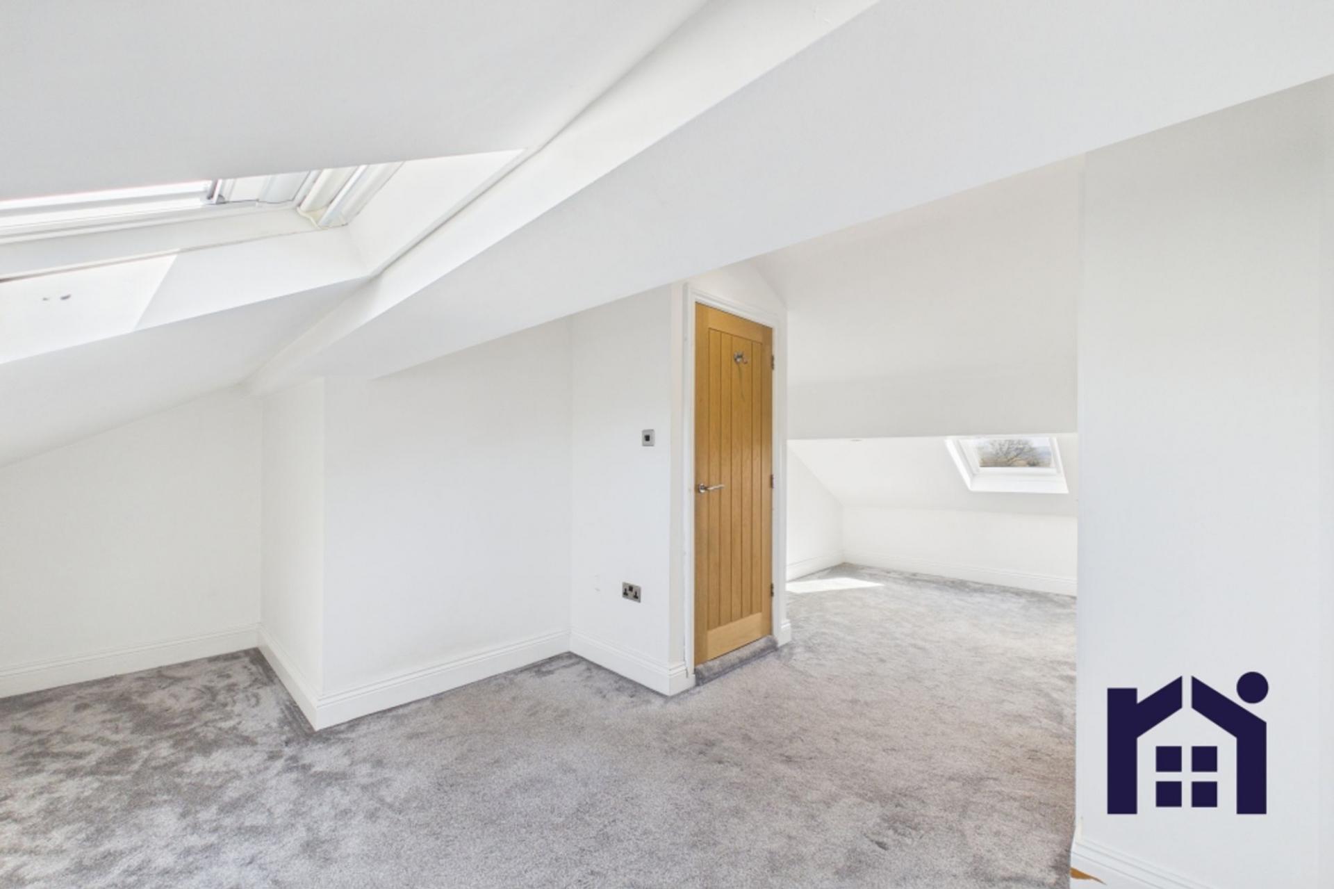 The second floor hosts a further bedroom with roof lights and ample storage, along with an en suite comprising an electric shower, wash hand basin, WC and ladder heated towel rail.