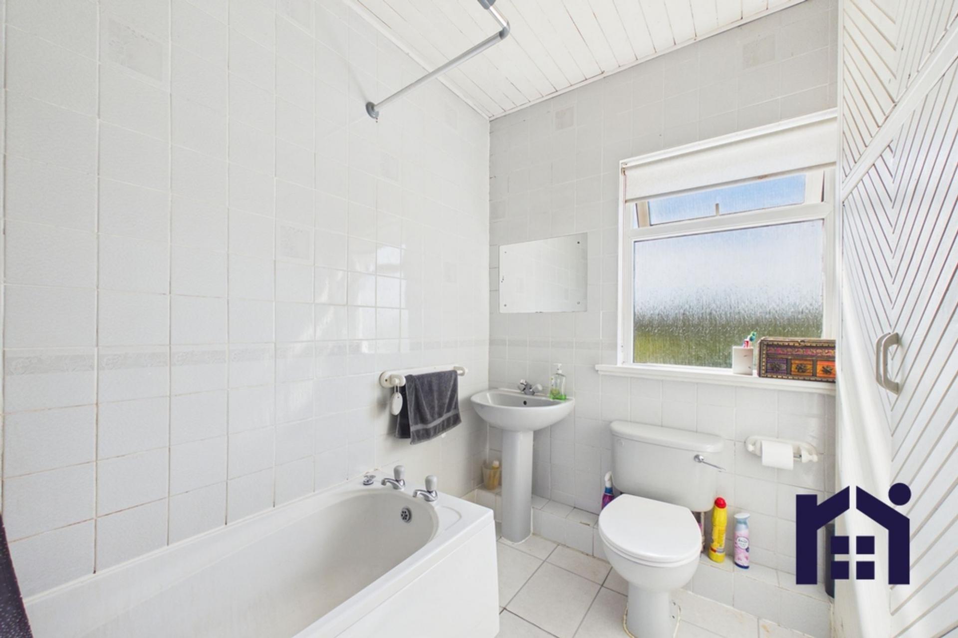The family bathroom comprises a bath with overhead shower, WC and wash basin.