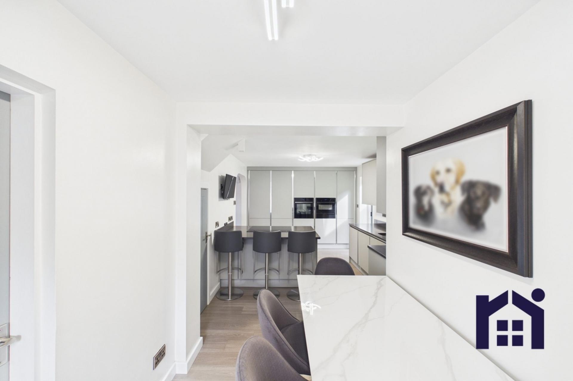 The heart of the home is the impressive open plan family room, offering generous space for both dining and relaxing. The sleek contemporary kitchen is fitted with a range of modern wall and base units, complemented by a breakfast bar and quartz work surfaces. Integrated appliances include a Neff induction hob with guided air downdraft extractor, electric oven, warming drawer, microwave, dishwasher, washing machine, and full height refrigerator and freezer.