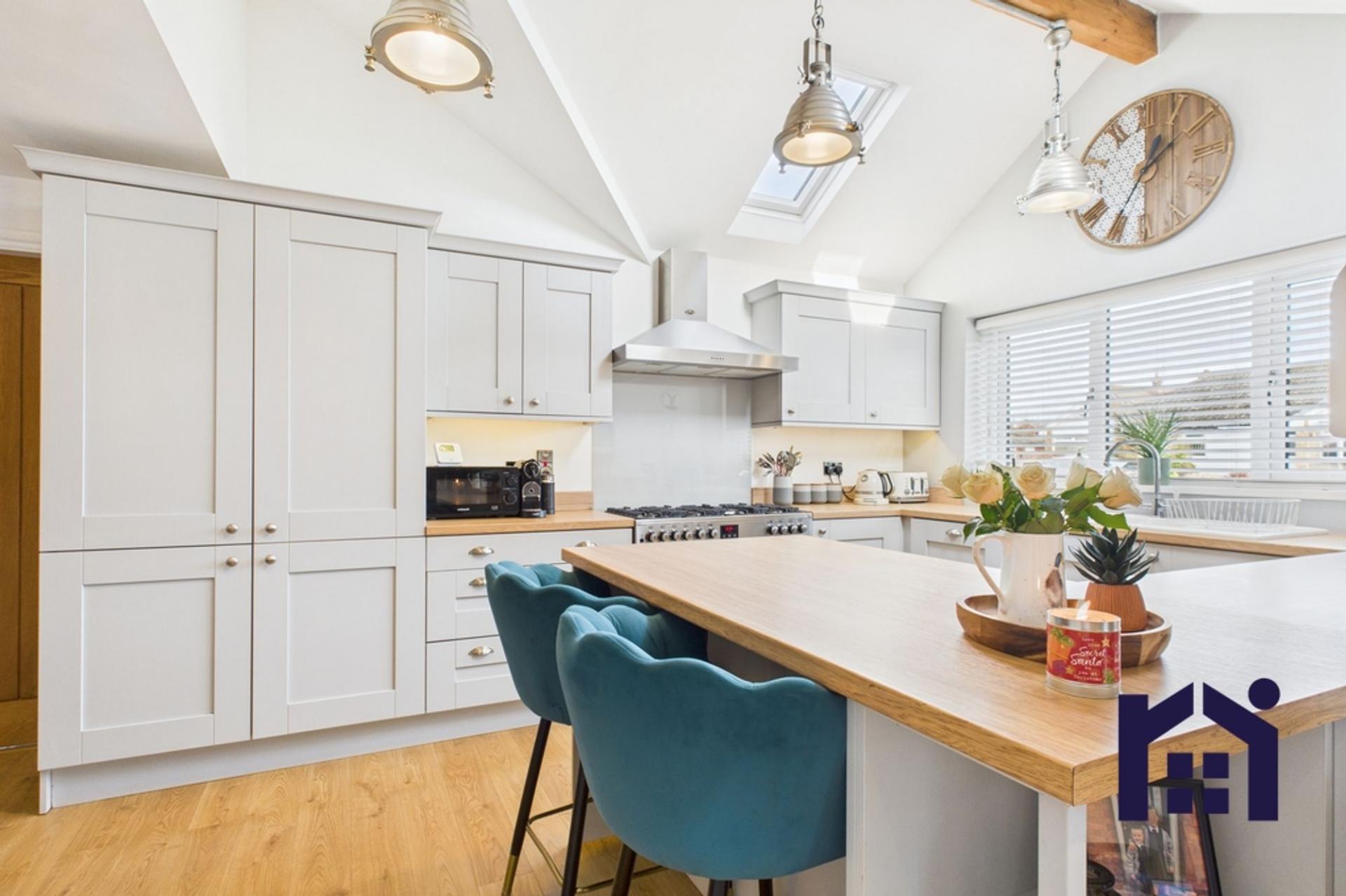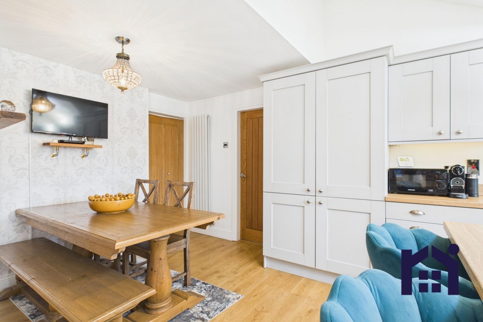 The well proportioned living room centres around a charming gas stove set within an imposing hearth with exposed brick feature wall. Bi-folding doors open directly onto the rear garden, allowing seamless indoor-outdoor living.