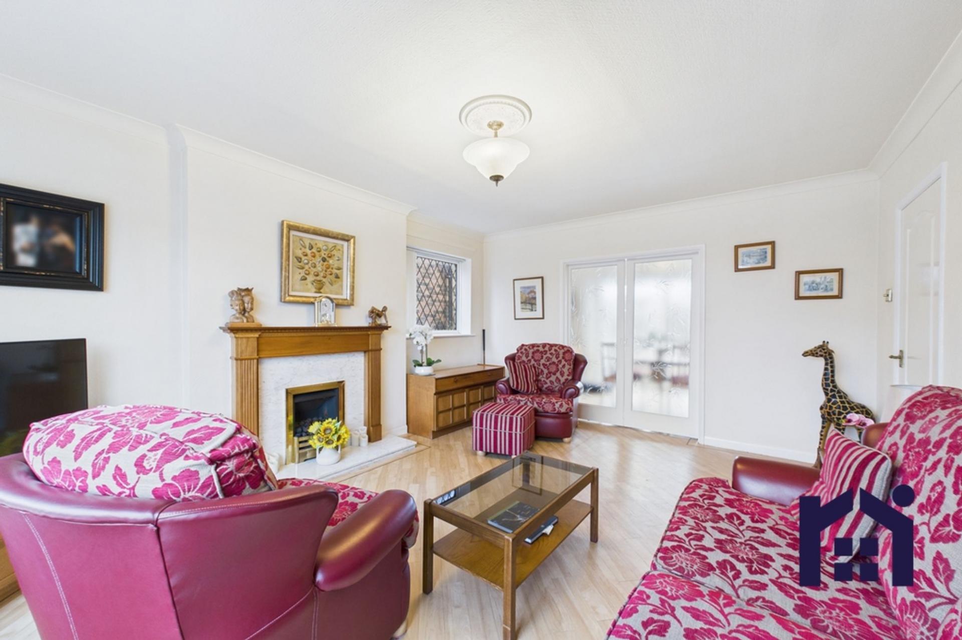 - Bright dual-aspect living room with gas fire and open-plan flow to dining room