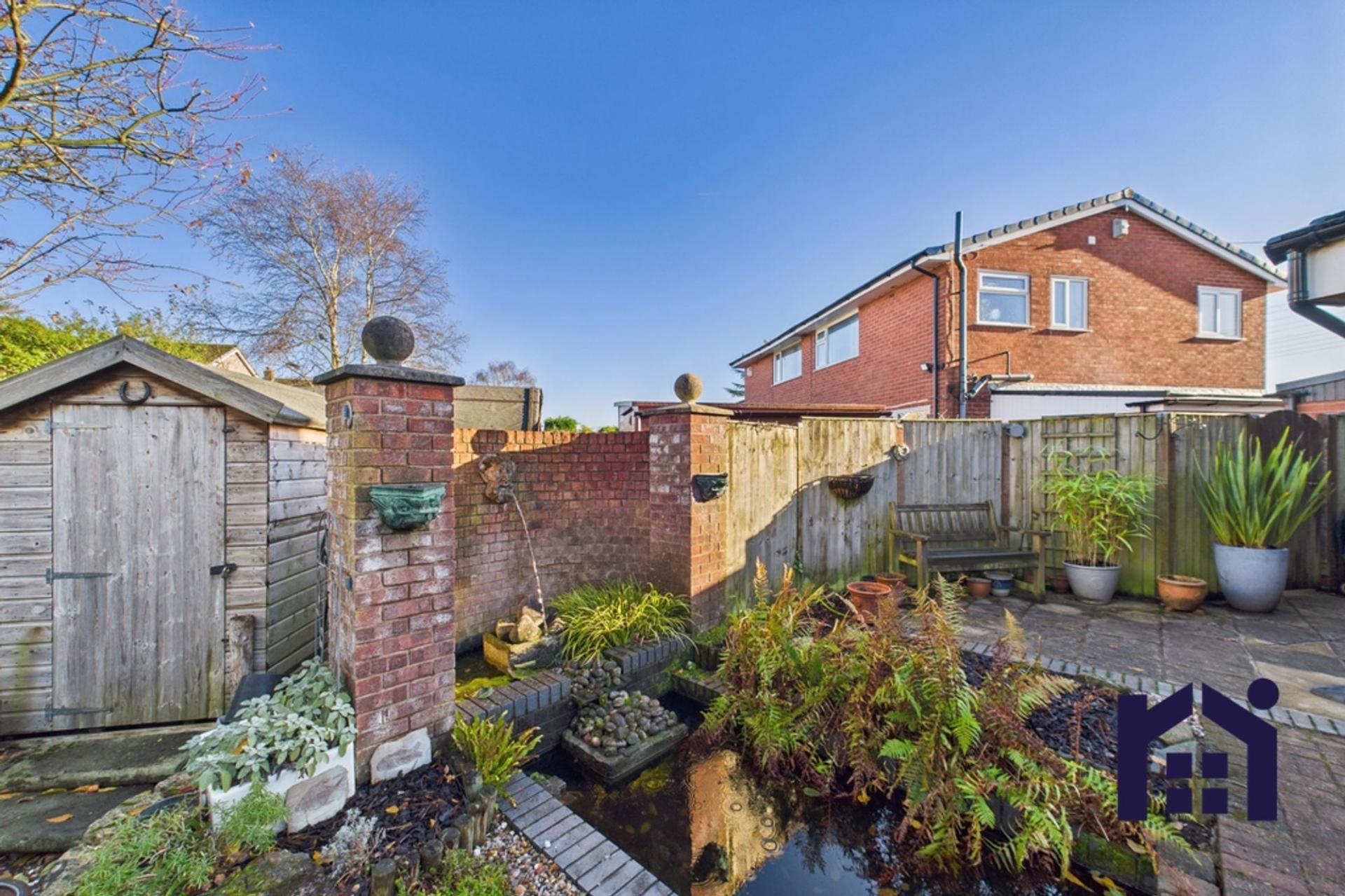 The space is flooded with natural light from Velux windows, patio doors and side panels overlooking the garden. Step outside onto the lower terrace, where you can enjoy the curved water feature and Zeus head fountain, continuing past mature planting to vegetable plots, the upper terrace, and a hedgehog hotel.