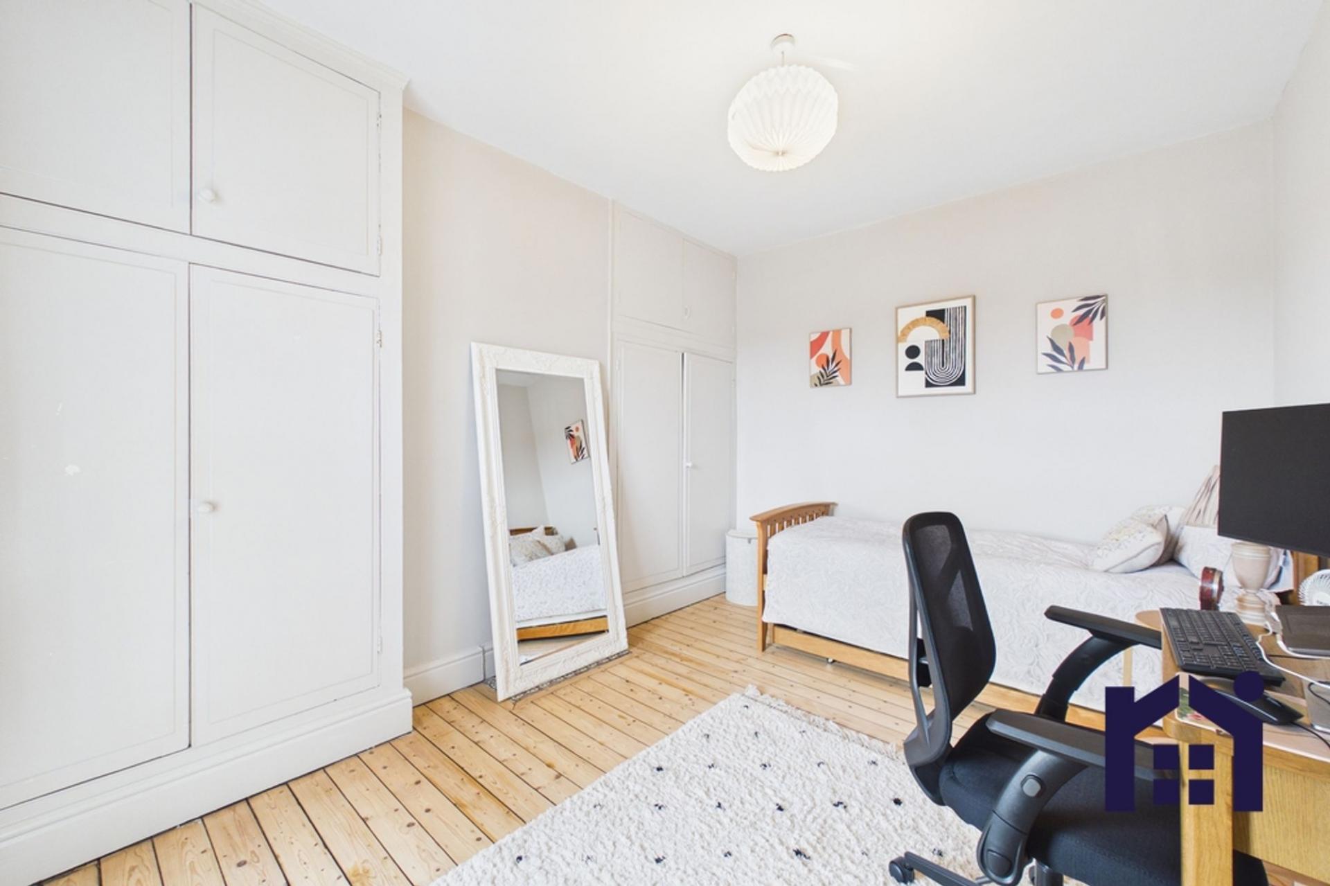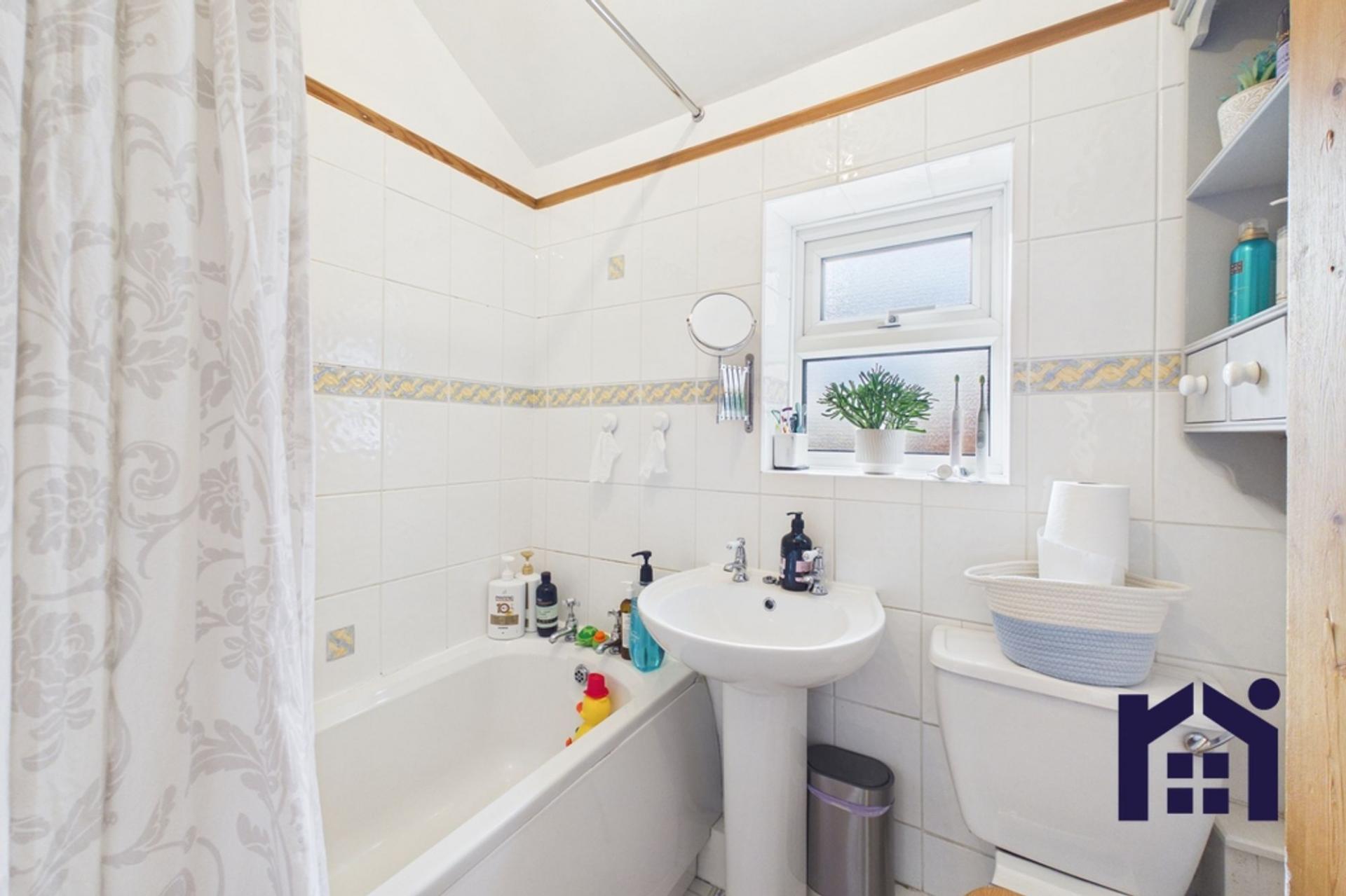 To the first floor, the landing provides loft access. The largest bedroom is a generous double with two large windows allowing for excellent natural light, along with ample wardrobes which will be left in situ. The second double bedroom enjoys views over the rear garden and features two built-in storage cupboards. The third bedroom, also a double, is currently arranged as a loving nursery.