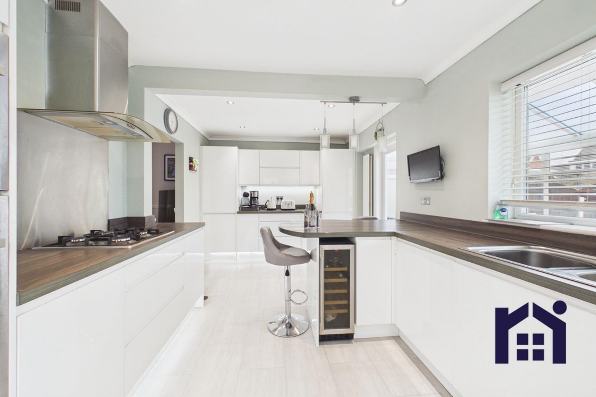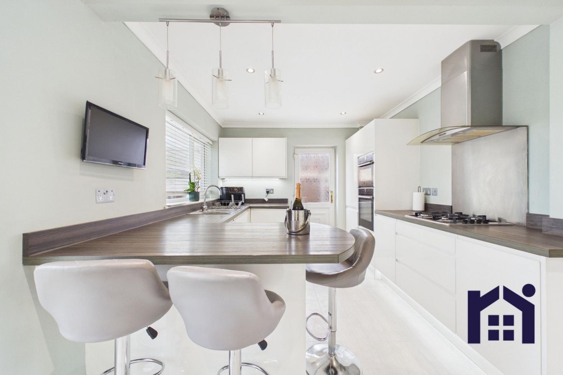 To the rear, the property opens into a well-appointed modern kitchen, thoughtfully designed with a range of integrated appliances including an oven, hob, extractor, wine fridge, fridge/freezer and dishwasher. There is generous worktop space alongside a breakfast bar for informal dining. The layout flows seamlessly into a light-filled conservatory, currently used as a dining area, this space enjoys lovely views over the garden and provides an ideal setting for both everyday living and entertaining.