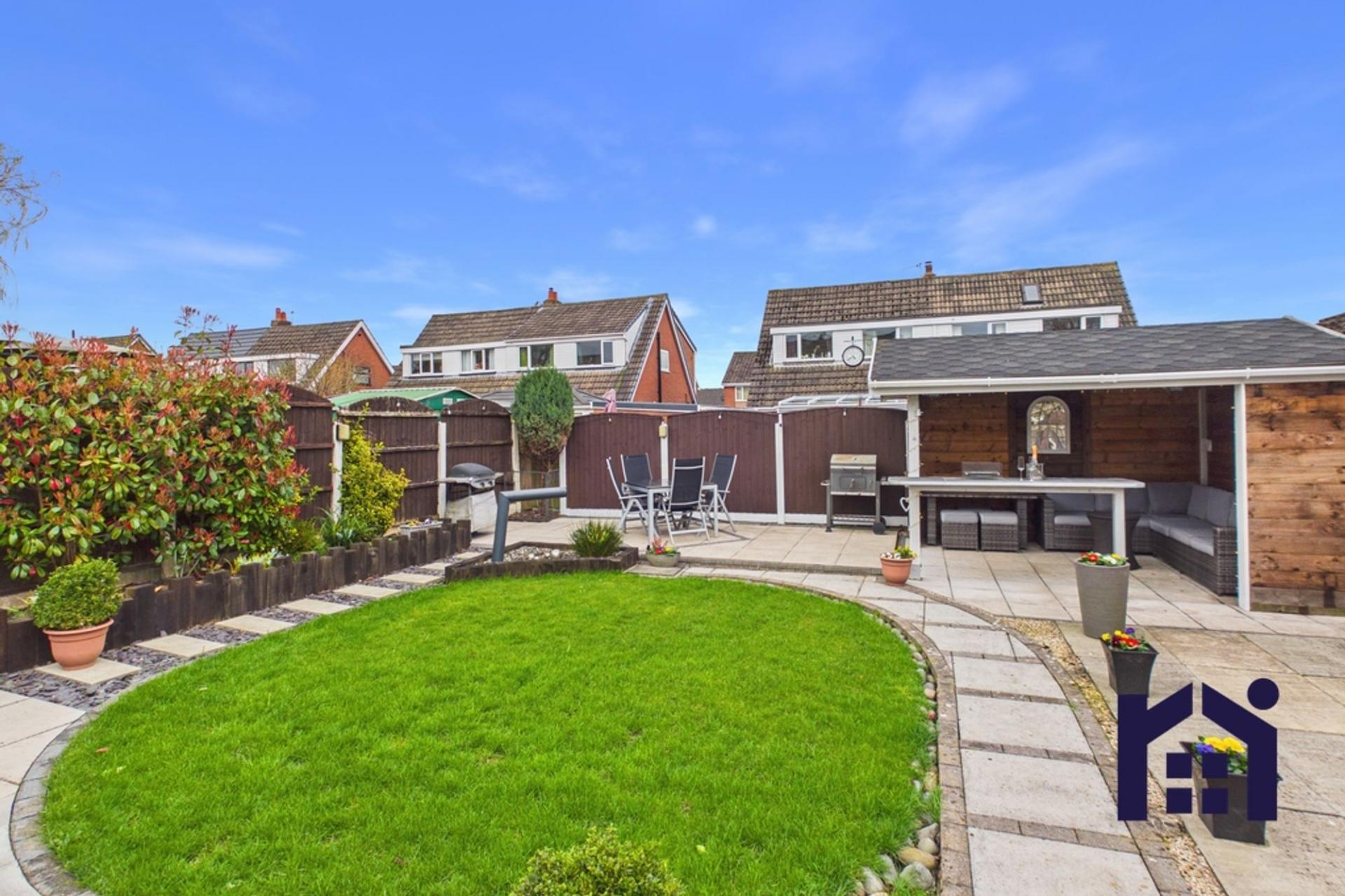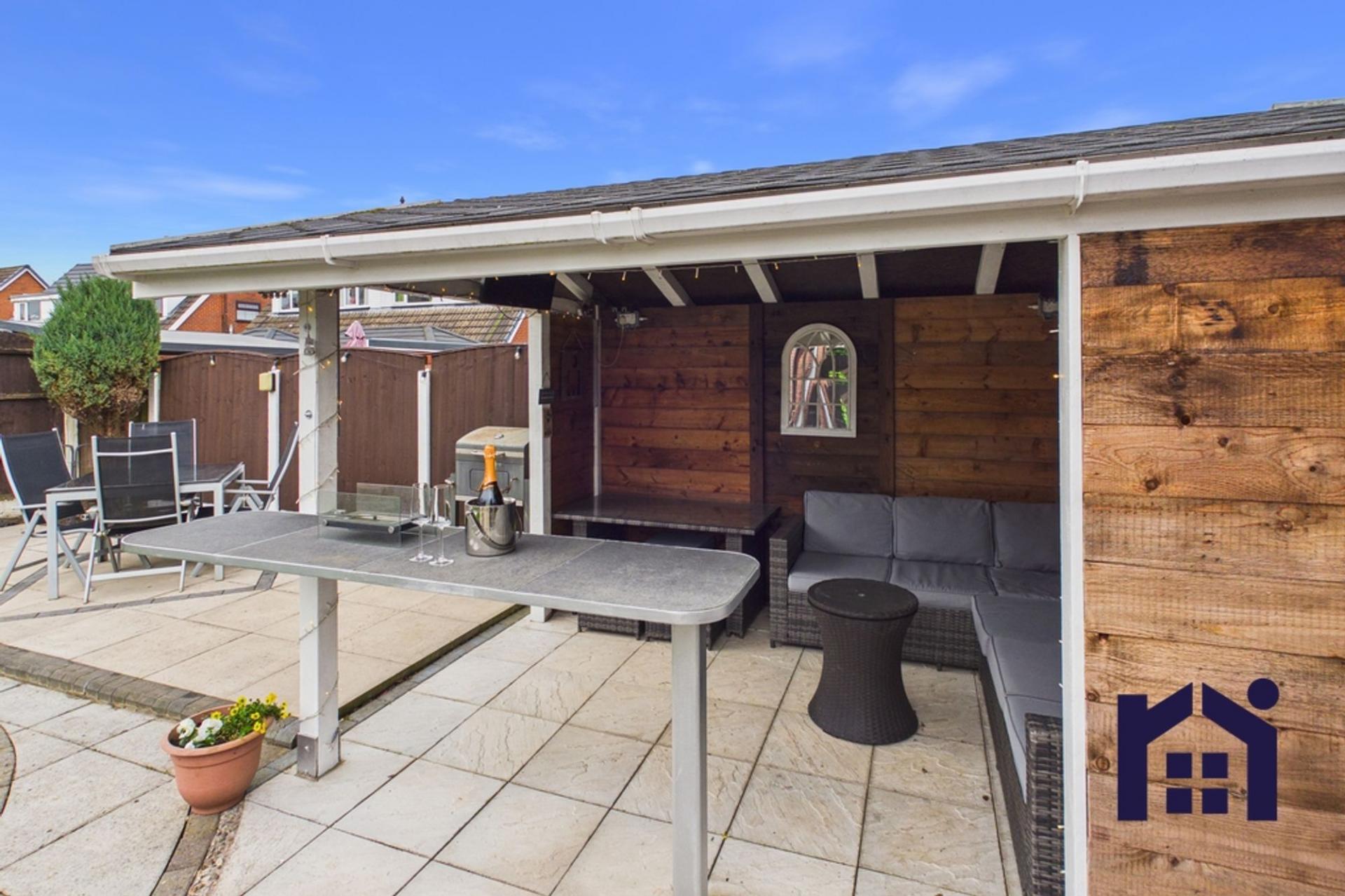 Externally, the south-facing rear garden is a real highlight, enjoying plenty of sunshine throughout the day. It has been thoughtfully arranged with a mix of lawned and paved areas, along with a covered seating space complete with power and heating, creating an ideal environment for relaxing or hosting. A dedicated BBQ area further enhances the space, and being the largest garden on the street, it offers excellent room for families and outdoor activities.