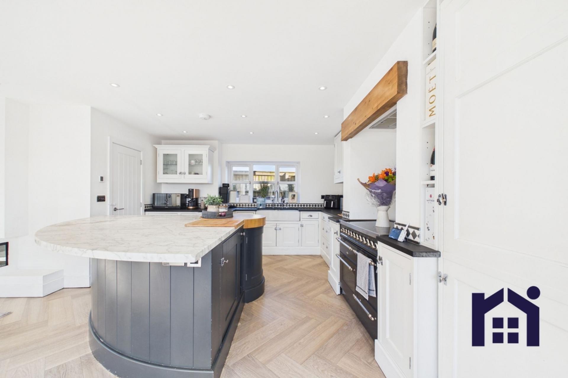- Stylish two-tone kitchen with marble island and integrated appliances
