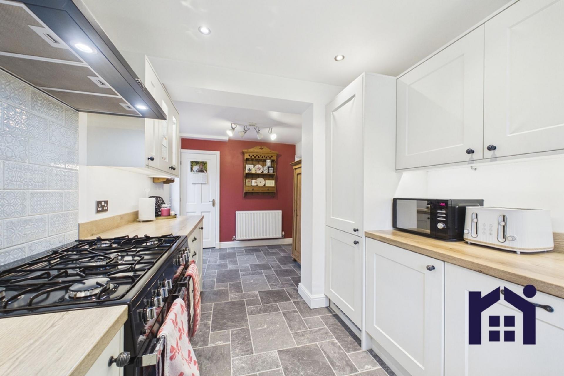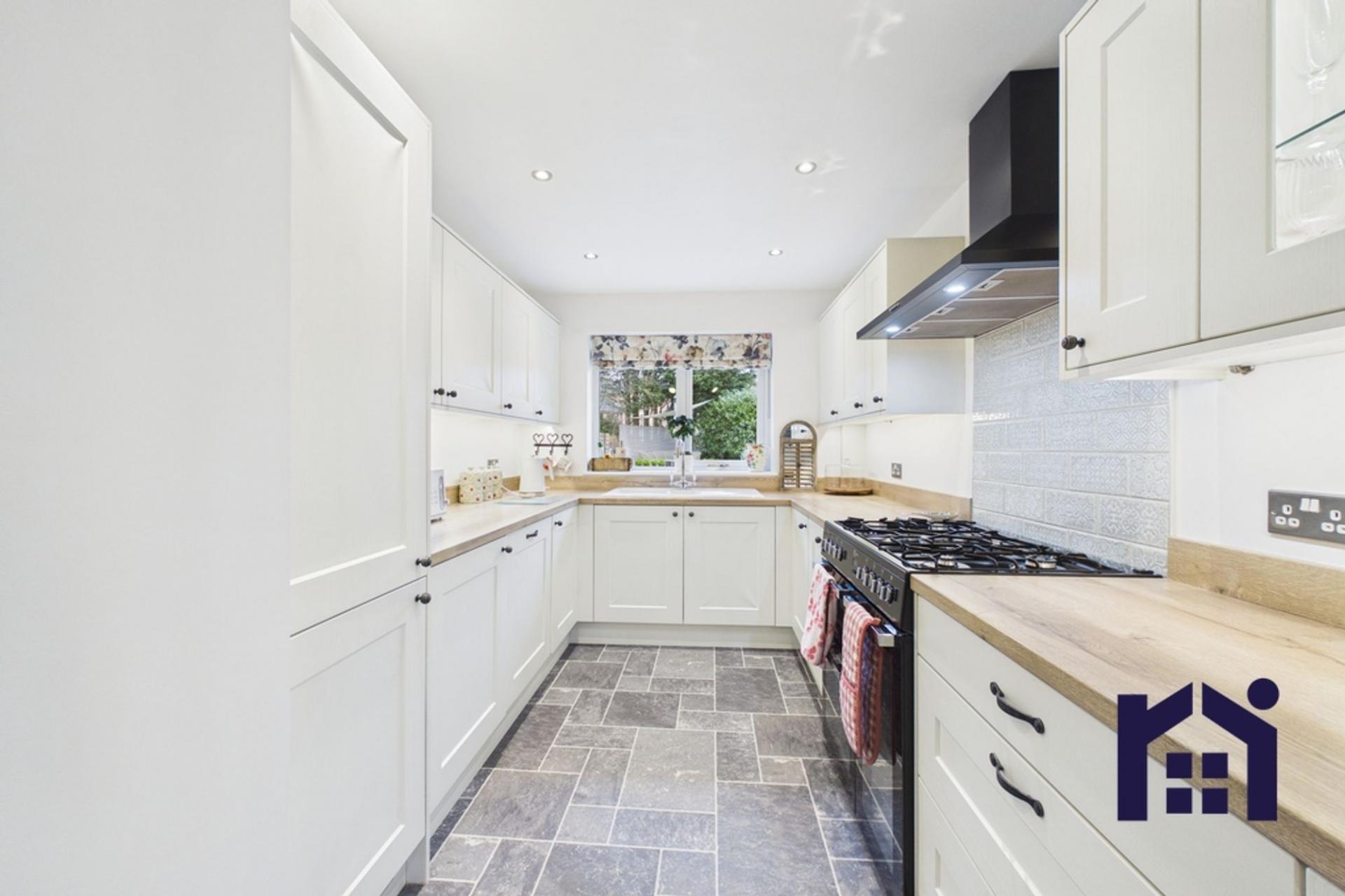 To the rear, the generous dining room offers ample space for a large family table and enjoys pleasant views over the garden. The modern kitchen, renovated in 2022, is finished in cream with wood-effect worktops and a range of wall and base units, providing excellent storage and workspace. Features include a ceramic sink overlooking the garden, integrated fridge freezer and dishwasher, with space for a Range-style cooker.