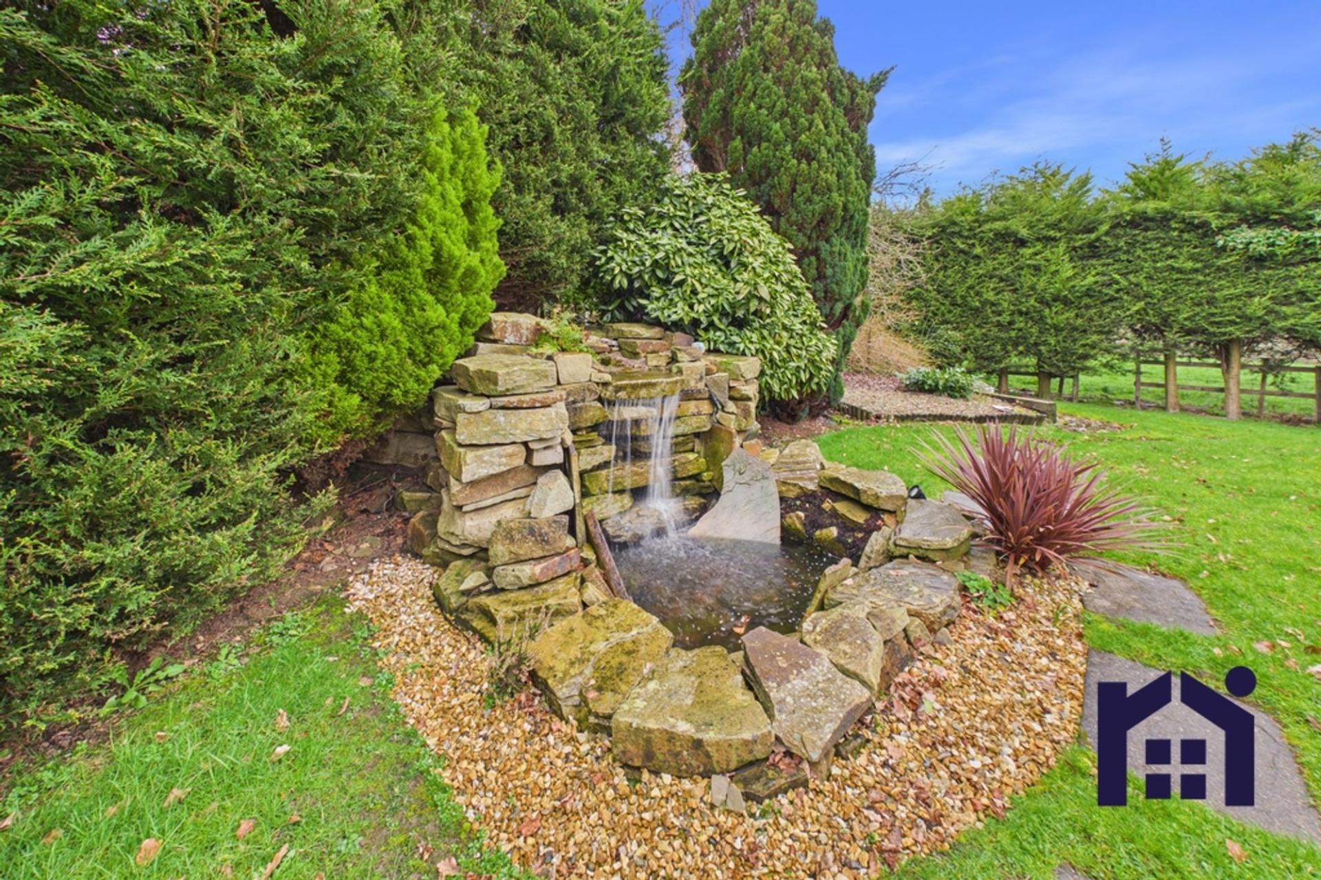 Step outside into the private, south-facing rear garden, featuring a striking waterfall water feature and enjoying open countryside views beyond, creating a peaceful and scenic backdrop.